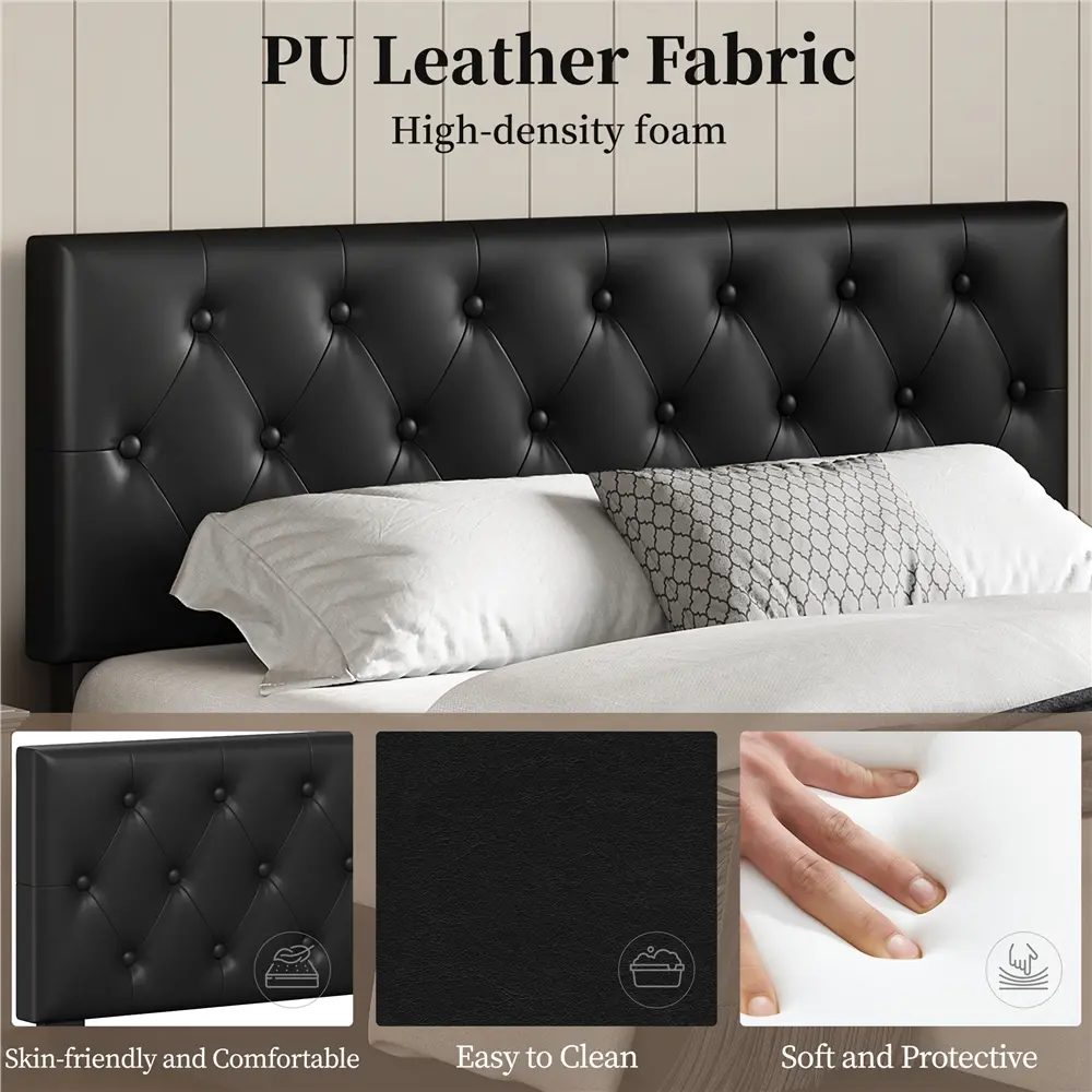 1. Sturdy and Durable: Made of premium wood material and selected PU leather and crafted of a solid steel metal frame, this exclusive bed frame can bear weight up to 800lb, durable for long-lasting use