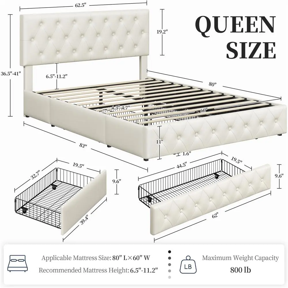 3. Underbed Storage: The equipped with a large wire netting drawer for queen size storage bed measuring 44.5″ L × 19.5″ W × 6″ H and two side small drawers of 32.7″ L × 19.5″ W × 6″ H, providing sufficient storage space to accommodate your bedding items and such in order