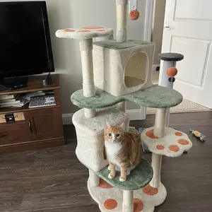 3. Cozy Lounging Areas: This attractive cat activity tower features a reinforced cat base, multiple scratching posts, two cozy upper deck viewing perches, two condos for hiding, and three extended platforms for lounging to offer your cats an activity paradise