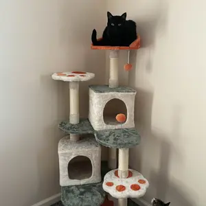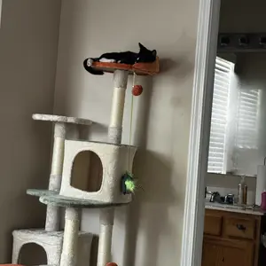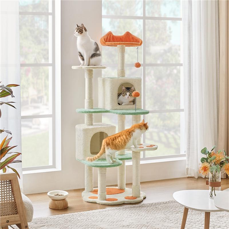 This cat tree offers various spots for relaxation, including a sturdy base, multiple scratching posts, comfortable perches for viewing from above, two cozy condos, and extended platforms for lounging. The sisal-coiled scratching posts flawlessly mimic tree bark's texture and maintain your pet's claws' scratching and health. This cat tree fulfills your cat's essential needs, from lounging and napping to playing and scratching—an ideal addition to any household with a love for cats.
