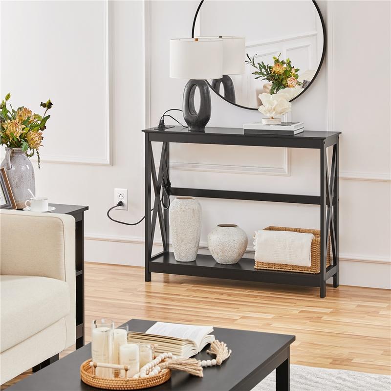 1. Classic Sofa Table with Outlet: Measuring 40″ L × 32″ H × 11.8″ W with a textured solid color look, this classic sofa/console table is the type that people have loved for years for its timeless elegance and practicality. The added outlet makes it even more friendly to serve appliances like lamps, phones, and speakers