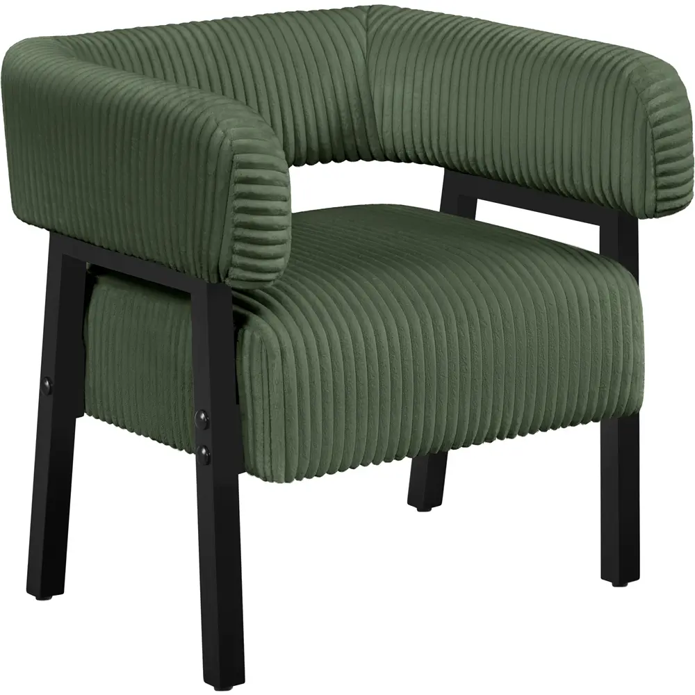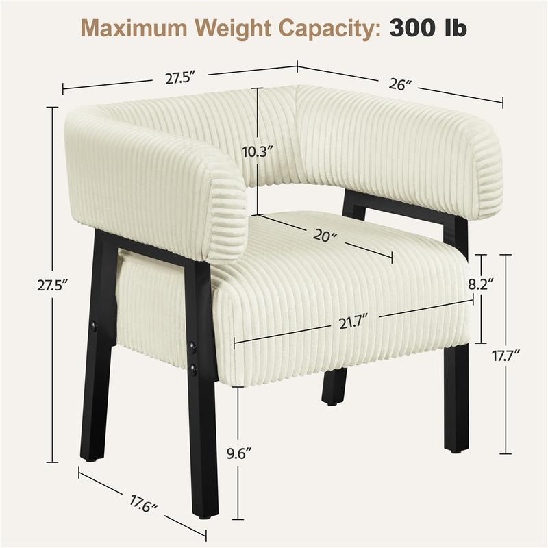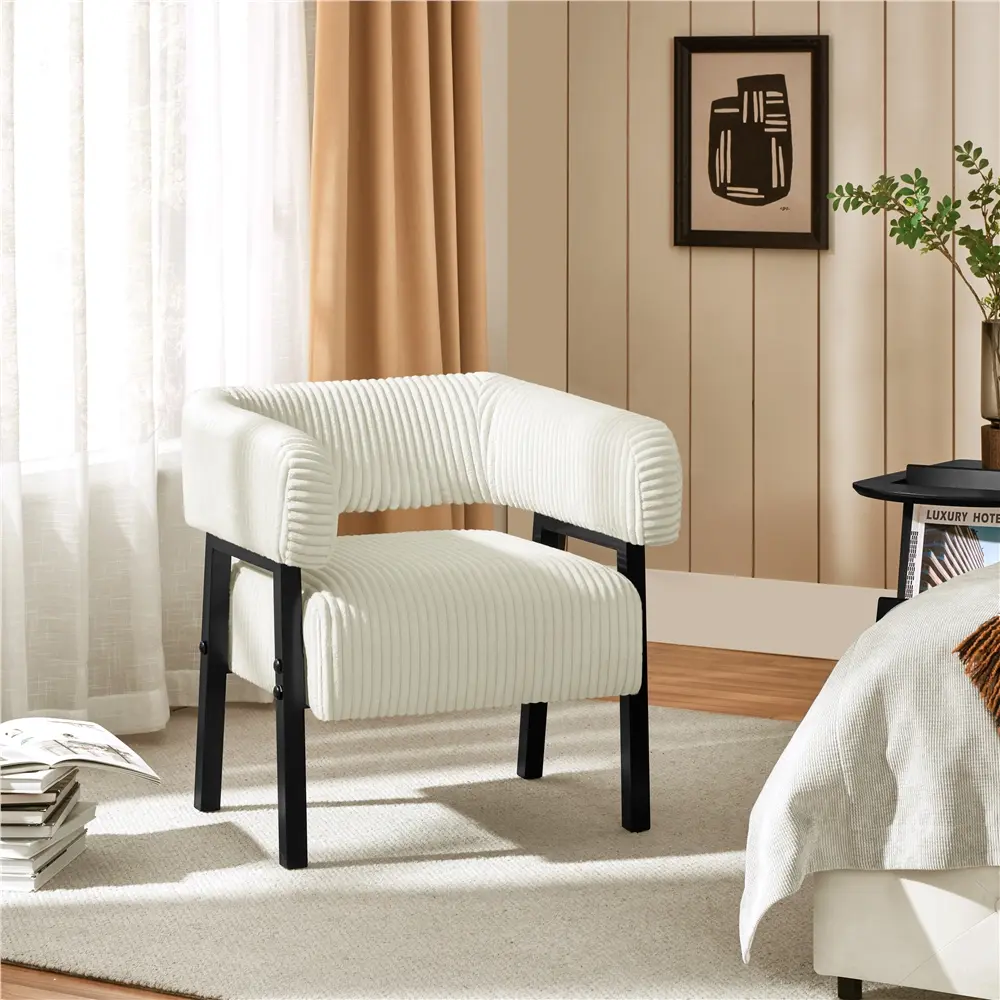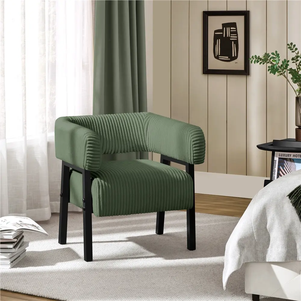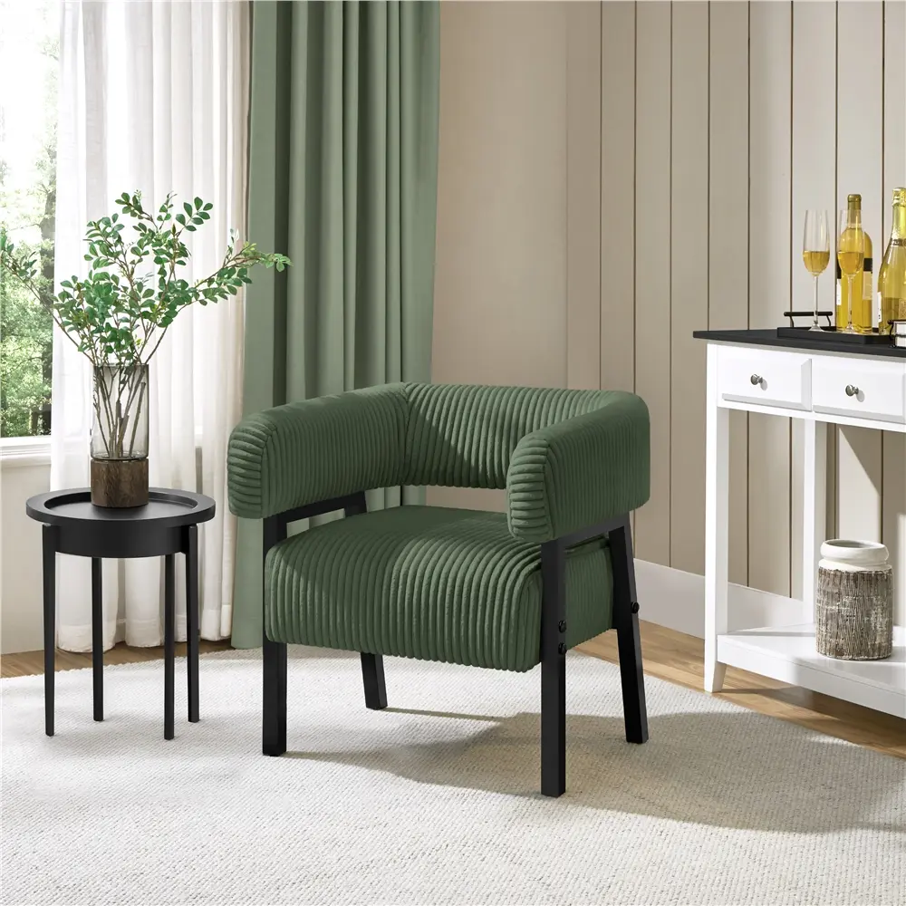 Elevate your space with this cozy corduroy accent chair, designed to add both elegance and visual appeal to any room. Supported by sturdy rubberwood legs and a strong manufactured wood frame, it offers exceptional strength and stability. The wraparound backrest and arms, paired with a plush pocket coil seat, provide lasting comfort and support, keeping you relaxed for hours. With its graceful curves, stylish flared legs, and richly textured polyester corduroy fabric, this fashionable chair makes a bold impression in any setting—be it the living room, lounge, bedroom, office, café, or elsewhere.