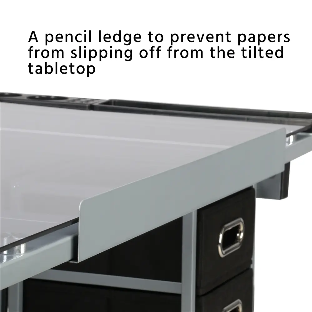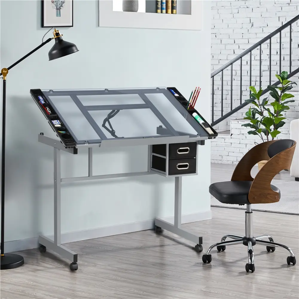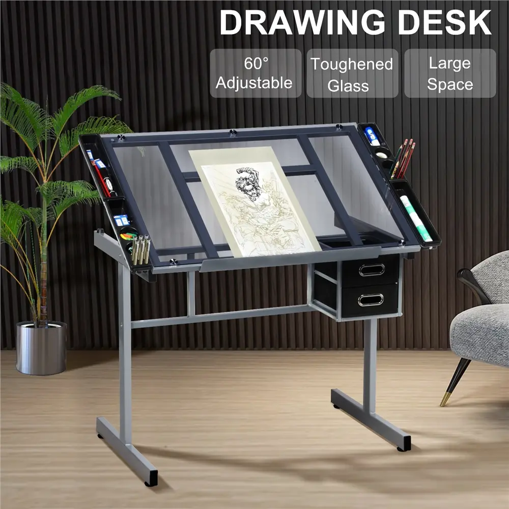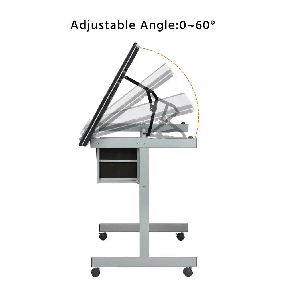 This angle-adjustable drafting table is definitely what you want. The stylish drafting table is crafted of a powder-coated steel frame and tempered glass desktop. The adjustable desktop angle can be easily adjusted from 0 to 60°to meet your needs and drawing habits. Smooth glass edges and rounded corners can avoid unnecessary hurts or damage. The two fabric drawers and four side stationery trays provide ample stationery storage space. This rolling drawing station can be used as a light table, drawing table, computer table, or writing table.