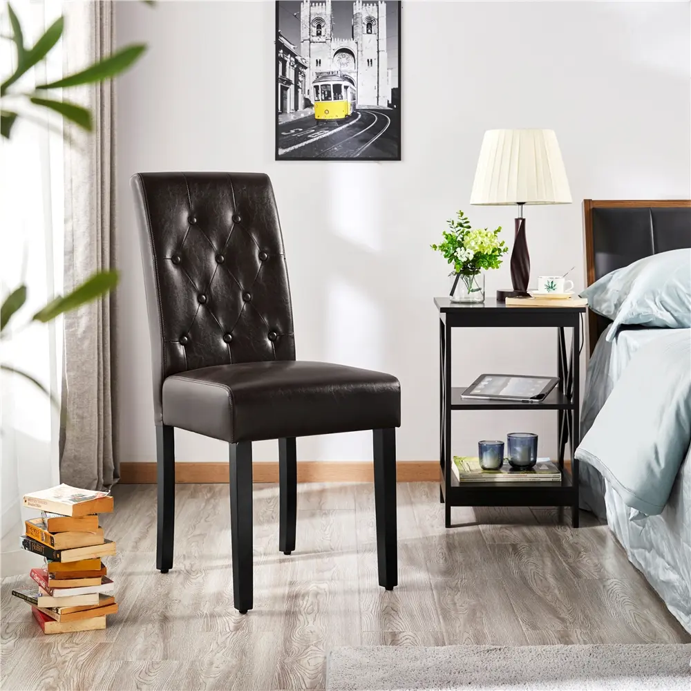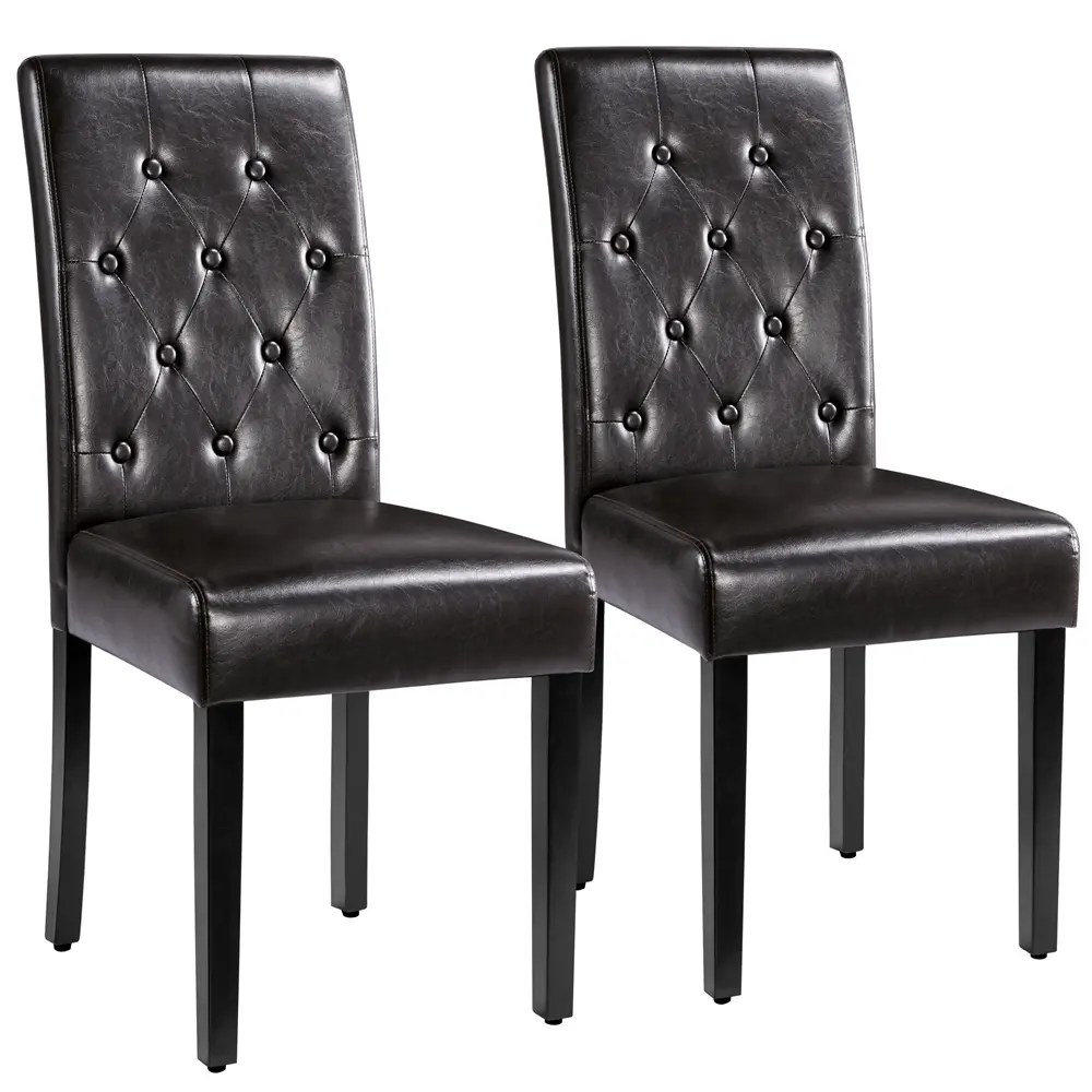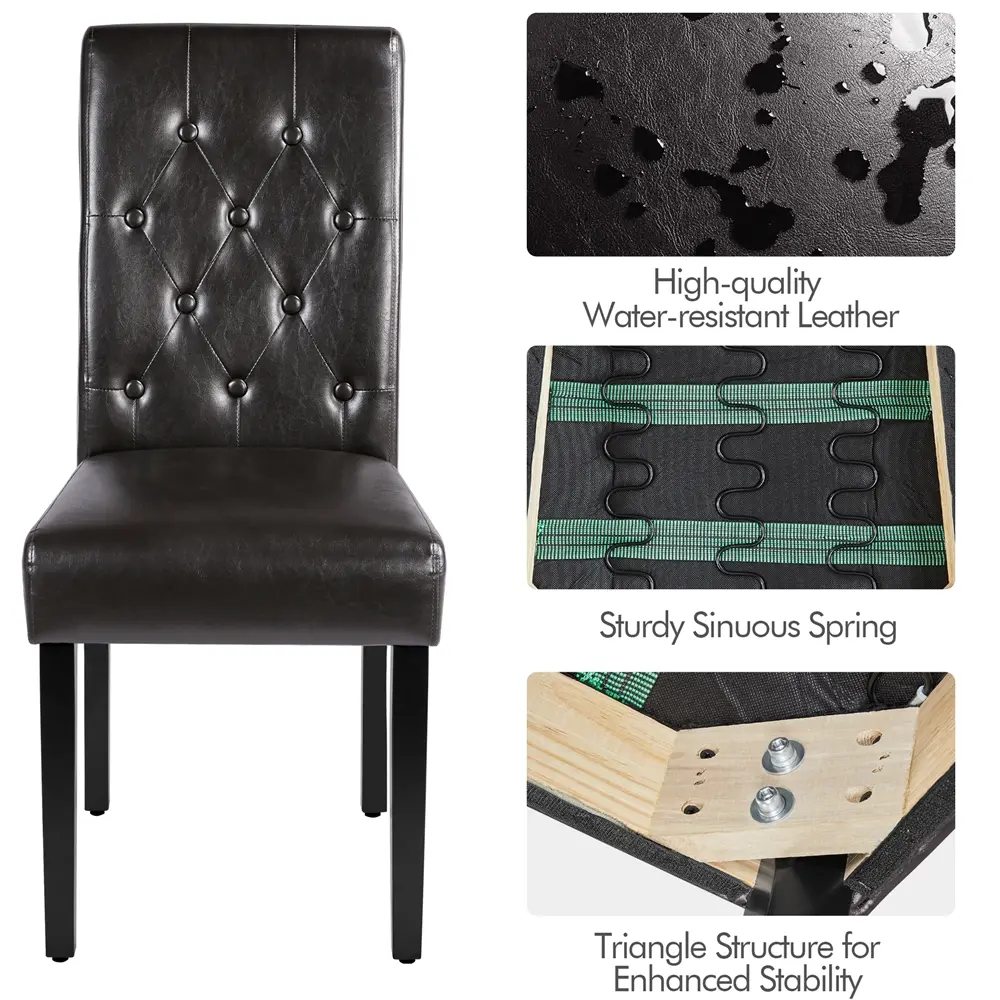 Designed for optimum comfort during extended periods of sitting, this dining chair set features a sturdy wooden frame and durable rubberwood legs to ensure stability. Upholstered in waterproof faux leather for easy maintenance, it offers a plush seating experience with high-density foam filling in the seat and backrest. The tall back provides ample support for ultimate relaxation. Adorned with tufted buttons on the backrest, this chair exudes a simple yet elegant style to elevate any space. Ideal for a home, cafe, or restaurant.