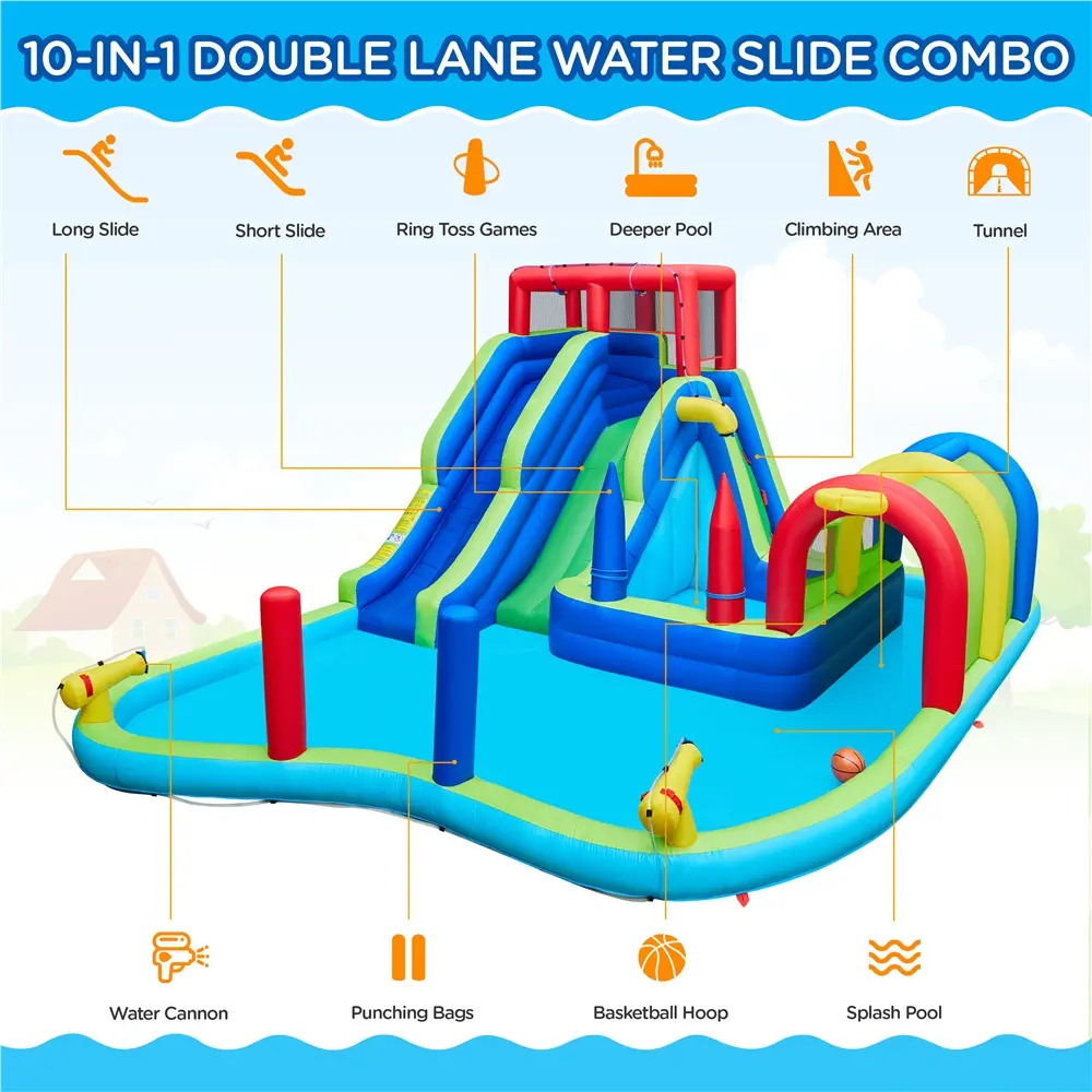 1.Slide Into A Refreshing Summer: Prepare for endless excitement with this double-slide inflatable water park! Packed with 9 thrilling features, including 2 water slides, a spacious splash pool, a smaller pool, a basketball hoop, a long tunnel, 2 water cannons, a ring toss game, 2 punching bags, and a challenging climbing wall, this water park offers non-stop summer fun for your kids
