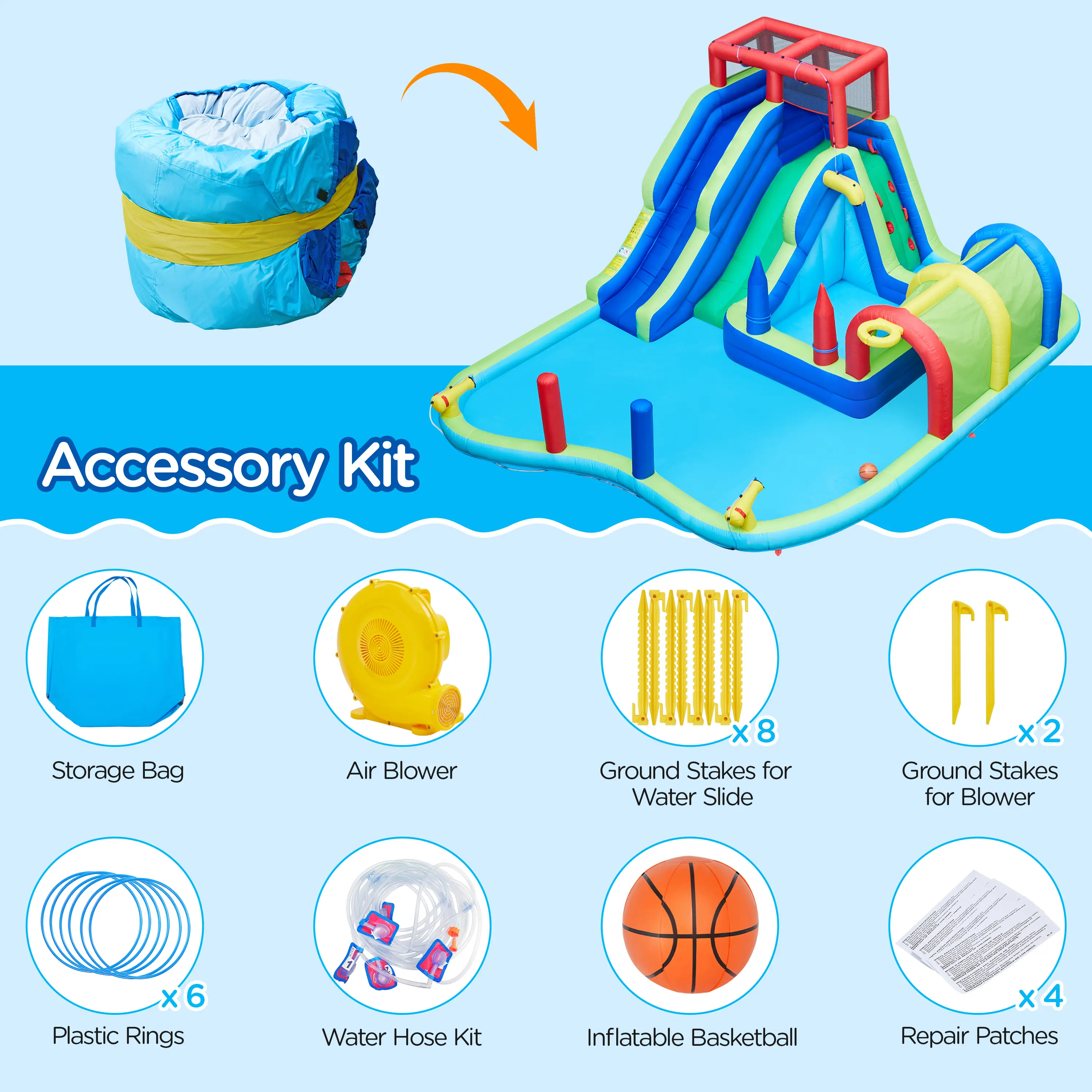 2.Versatile Water Park: Get ready for non-stop fun with our double-slide inflatable water park! It presents kids with multiple fun features for various enjoyments - 2 water slides, a large splash pool, a small deeper pool, a basketball hoop, a long tunnel, 2 water cannons, ring toss game, punching bags, and a climbing wall