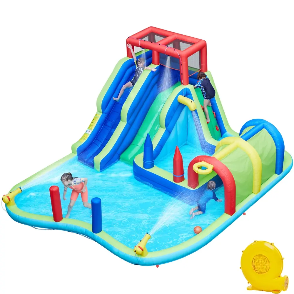 Get ready for boundless summer fun with the Double Lane Water Slide Combo! It features 9 exciting activities for endless entertainment, including 2 water slides, a splash pool, a deeper pool, a basketball hoop, a long tunnel, 2 water cannons, 2 punching bags, 2 ring toss targets, and a climbing wall with footholds. Made from rugged PVC-coated 420D and 840D polyester fabric, this water slide combo is safely powered by a 650W ETL-certified air blower for quick inflation in less than 2 minutes. With dimensions of 16.8′ L x 13.8′ W x 7.6′ H, this inflatable can accommodate up to 4 kids aged 3 to 10, with a maximum weight of 117 lb per child. For your convenience, this set includes an inflatable, an ETL-certified blower, a storage bag, a water hose kit, a repair patch kit, 1 basketball, 6 plastic rings, and 10 ground anchors.