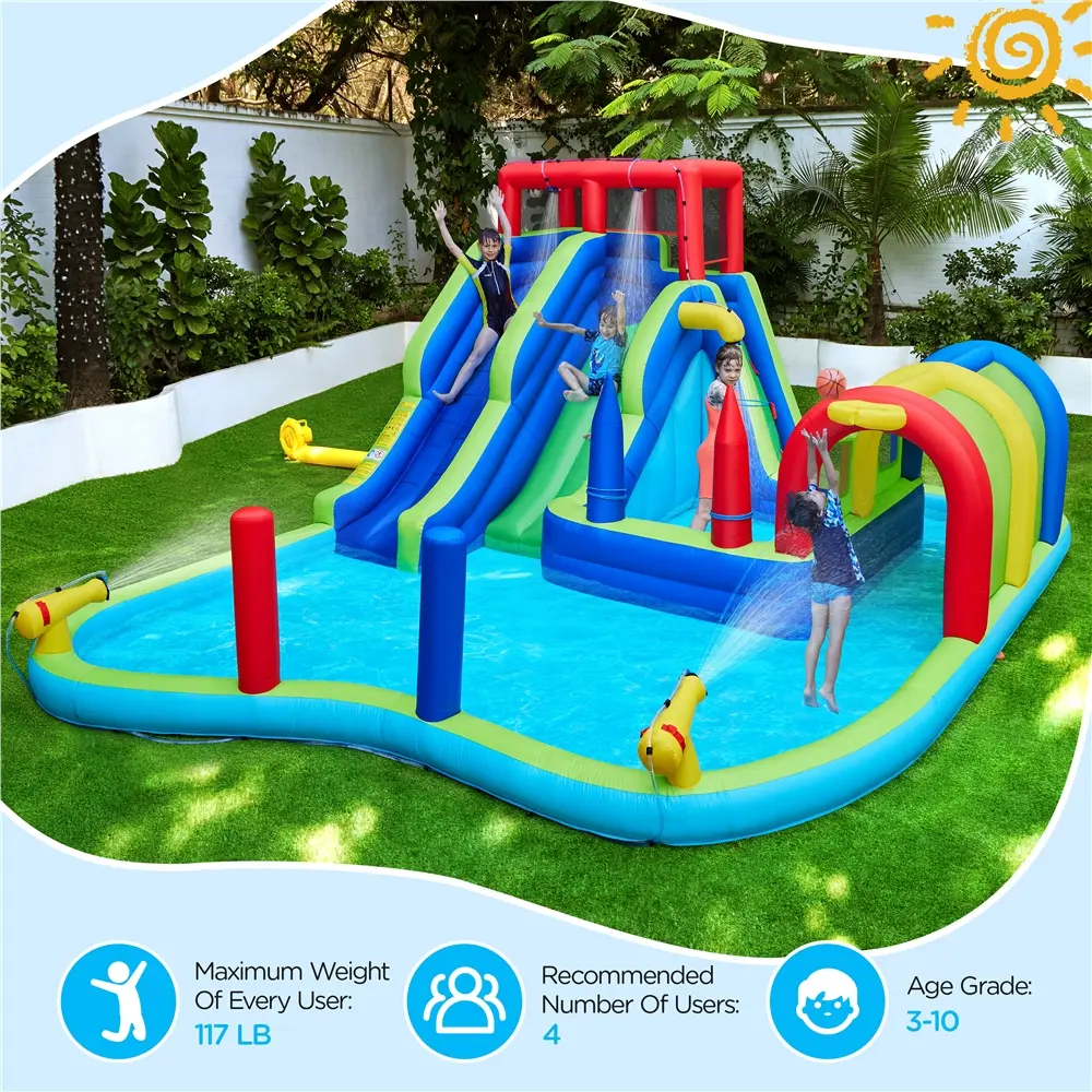 4.Hard-wearing Materials: Engineered for long-lasting fun, this inflatable water slide features PVC-coated 420D polyester fabric for the main body and hard-wearing 840D fabric with double to triple stitching on high-stress areas. It accommodates up to four children aged 3 to 10, each with a maximum weight of 117 lb