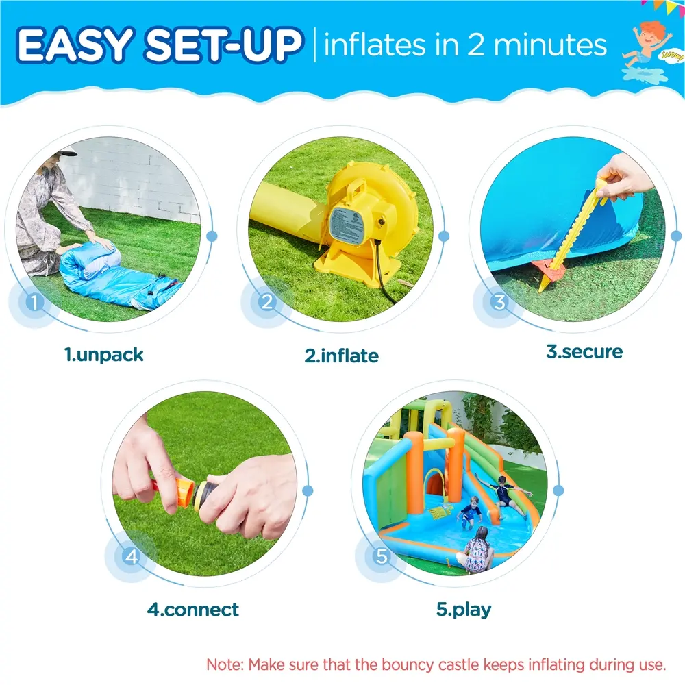 8. Complete Water Bounce House Set: This water bouncy house set includes a 520W ETL-certified blower with a 12.5′ long power cord, a storage bag, a basketball, a 38′ long water hose, 4 repair patches, and 10 ground anchors
