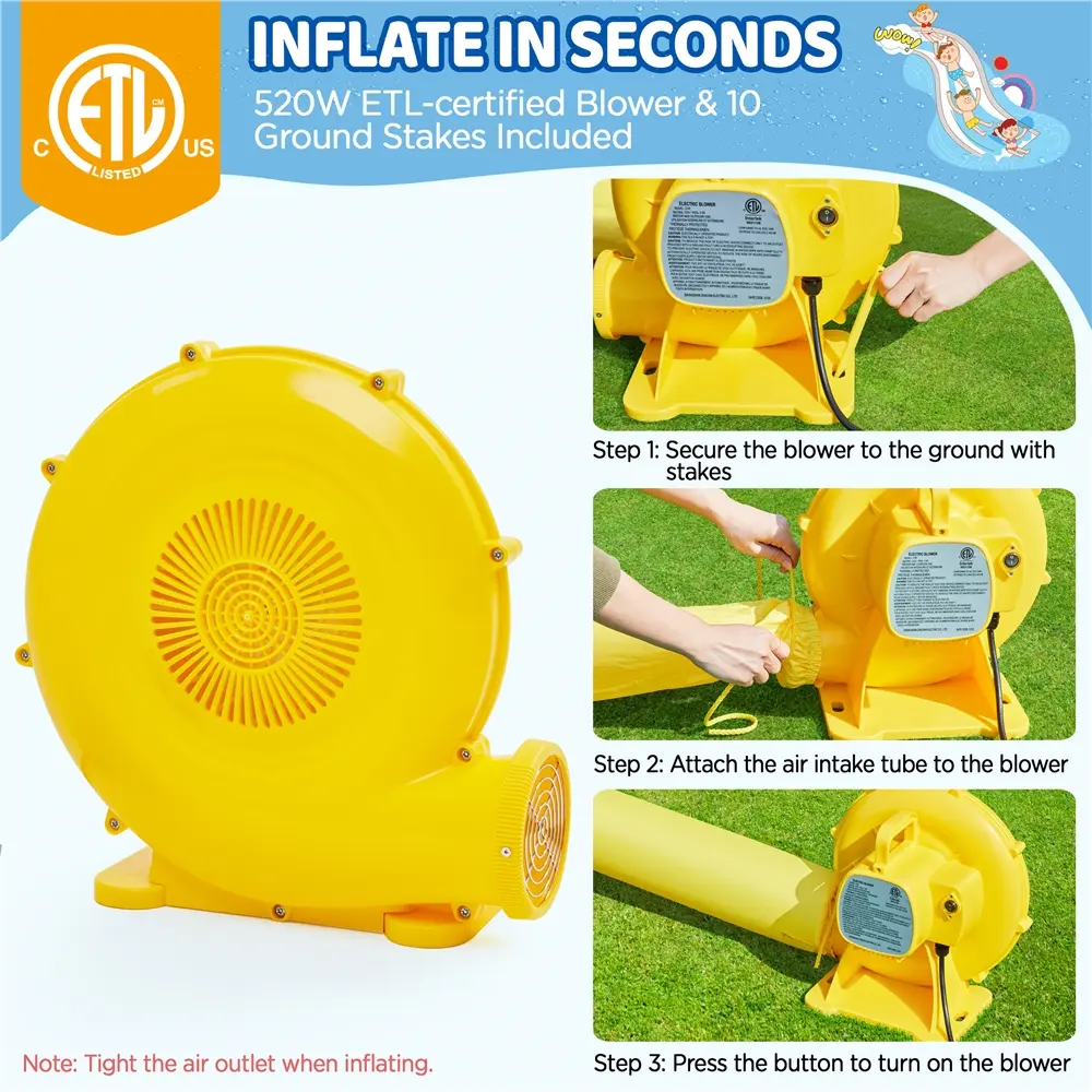 4. 520W ETL-certified Blower For Quick & Safe Inflation: This water bounce house inflates in just a matter of minutes. The powerful 520 W air blower certified by ETL ensures a quick and safe operation