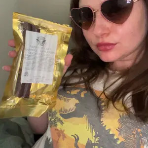 I'm totally obsessed with these yak sticks! They taste almost exactly like beef, but a little sweeter. These are all-natural and lean. I snack on them on long road trips. I ate.one just before I took the pic- I couldn't wait to rip open the bag!