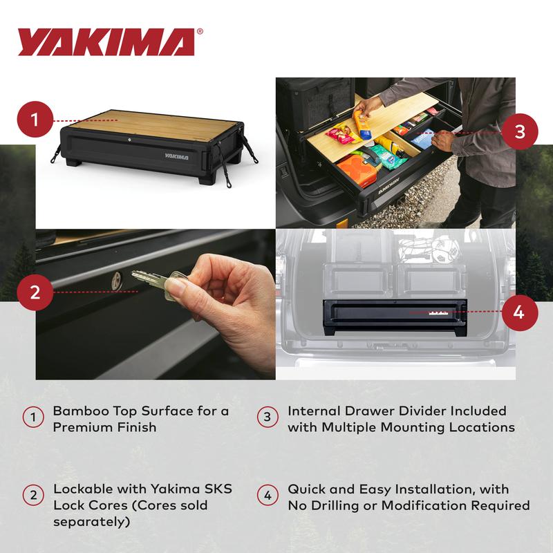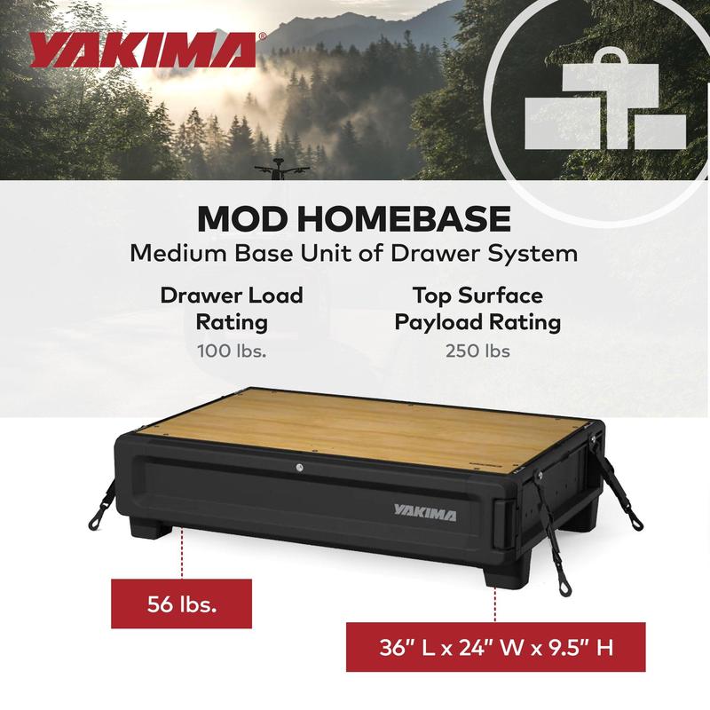 Discover the Yakima MOD HomeBase, the cornerstone of the MOD Drawer System, designed to revolutionize how you organize your tools, gear, and everyday essentials. Say goodbye to clutter and hello to efficiency with this sleek storage solution.Crafted from top-notch materials, this innovative base unit is engineered for durability and longevity, ensuring it stands the test of time with its sturdy aluminum construction that guarantees a noise-free experience. Adding a touch of sophistication, the bamboo top surface provides a premium finish that complements any space. At the same time, the heavy-duty drawer slides promise smooth operation every time you access your items. With an internal drawer divider included, customization is a breeze, allowing you to mount this travel accessory in multiple locations to tailor the storage space to your specific needs. Built-in attachment points enable seamless integration with toppers, totes, and even another HomeBase, maximizing versatility. Installation is a snap, just attach this base unit to the tie-downs in your cargo space, with no drilling or modification required. Security is paramount with a lockable feature for this storage essential using Yakima SKS Lock Cores (sold separately), providing peace of mind wherever you go. With impressive load ratings of 100 pounds for the drawer and 250 pounds for the top surface, you can trust this camping storage option to handle your heaviest gear with ease.Upgrade your storage game with the Yakima MOD HomeBase Base Unit of Drawer System, where durability, functionality, and versatility redefine your on-the-go storage experience.