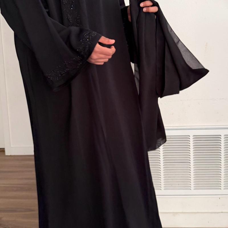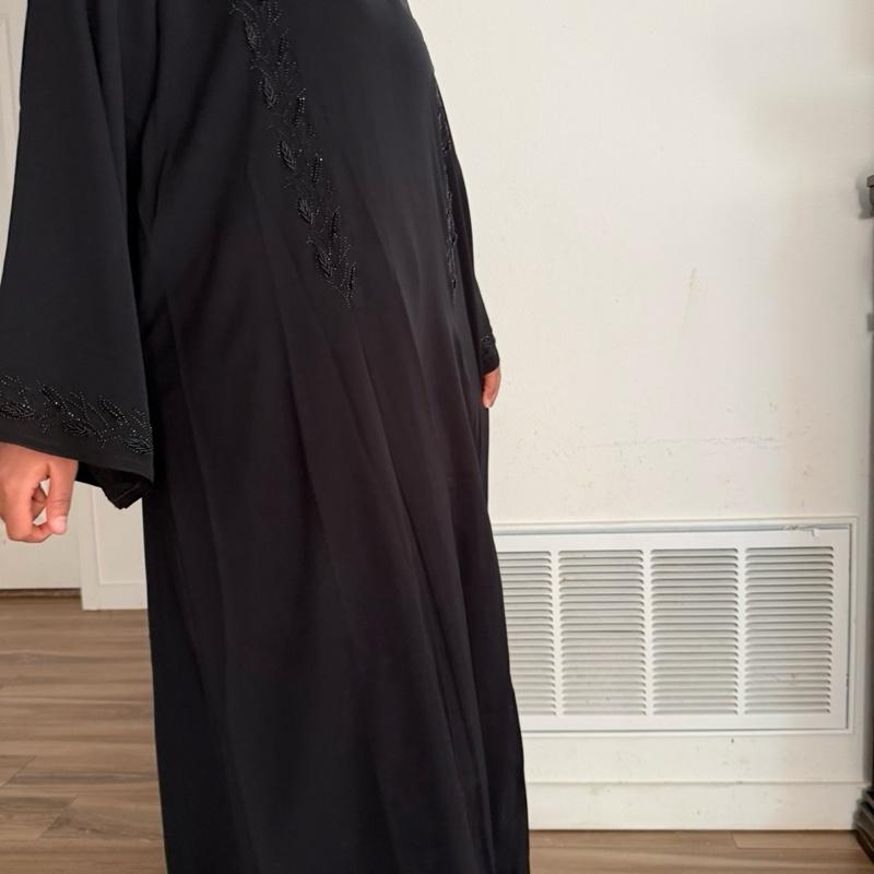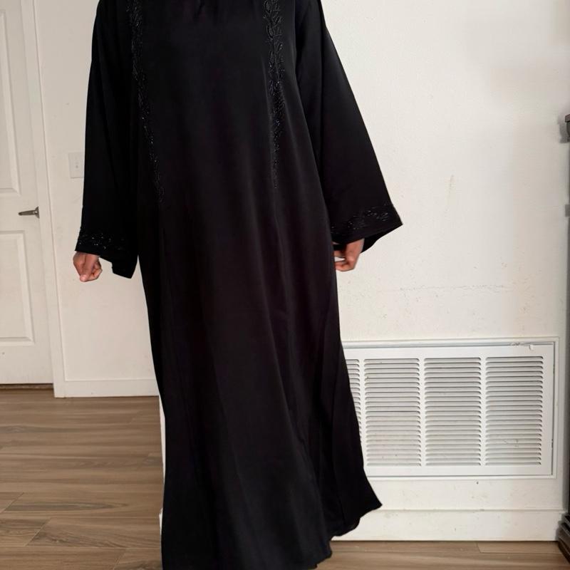 Elevate your wardrobe with this stunning black abaya, crafted from a luxurious and soft fabric that drapes beautifully. The abaya features intricate beadwork in a delicate leaf pattern, adding a touch of elegance that stands out against the sleek black background. Perfect for both formal occasions and everyday wear, this abaya combines timeless style with comfort. Its flowy silhouette ensures ease of movement, making it a versatile addition to any fashion