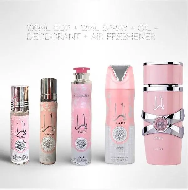 The Yara Signature Scent Bundle offers everything you need to stay fresh and fragrant all day long. Featuring the full-size 100ml Eau de Parfum, travel-size 12ml spray, concentrated perfume oil, gentle deodorant, and air freshener, this set surrounds you and your space in the soft, sweet elegance of Yara.