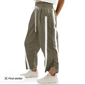 Love. Like a lightweight, softer windbreaker material. Size up one size. Usually a L, sized up to an xl and they’re loose and perfect. I’m 5’6 and they hit at the ankle like in photo.