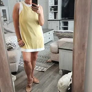 It’s cute, shorts are short, I think the top balance it out, 5’3 180 pounds I purchased a large, true to size, I like the mustard color, 100 percent cotton material