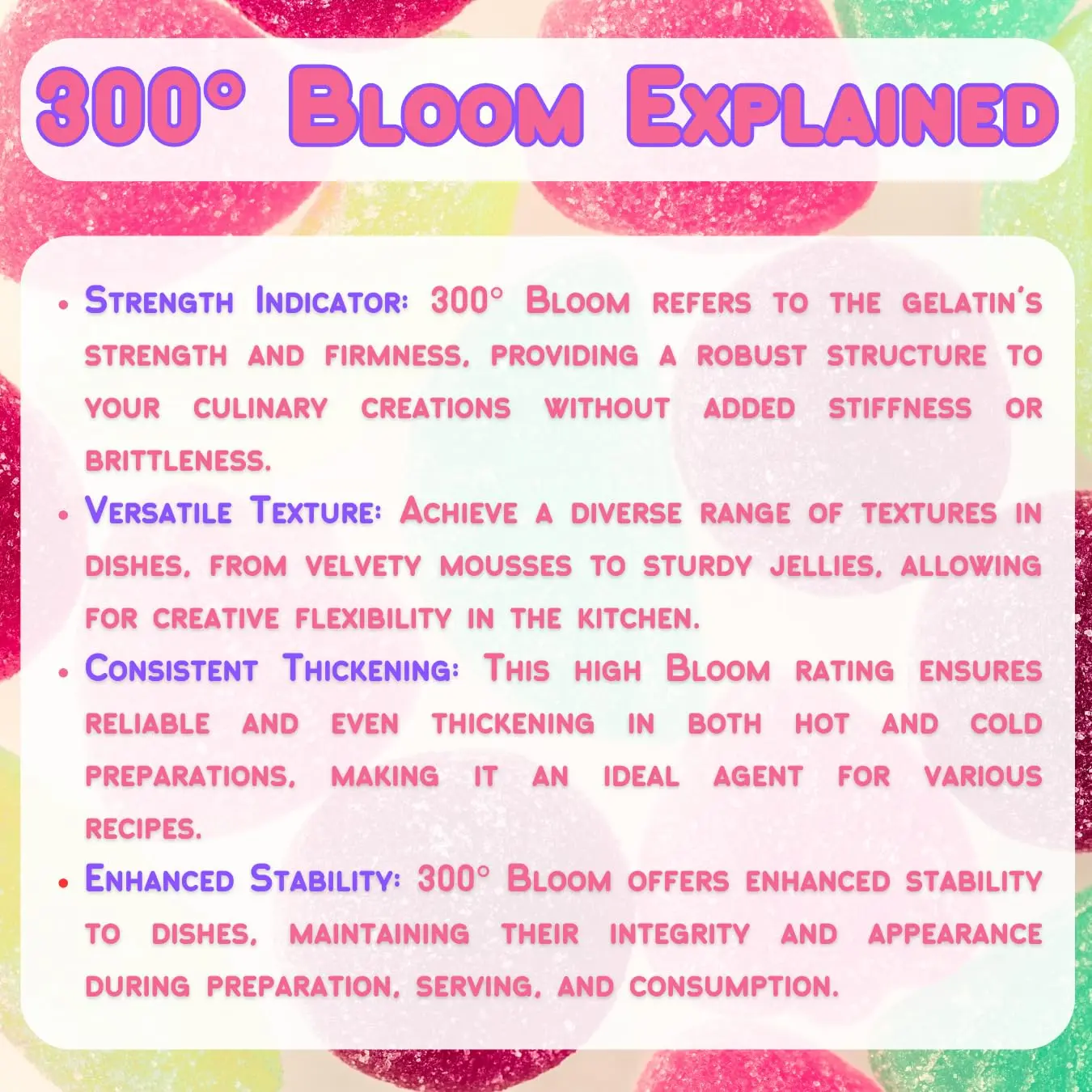 ·🔍 Unlocking the Secret: What Does 300° Bloom Mean? The term “Bloom” in 300° Bloom refers to the gel strength of the gelatin powder. A higher Bloom number indicates a stronger gel, meaning your preparations will boast a firmer texture and higher viscosity. The 300° Bloom ensures that you get a gelatin of superior quality and strength, offering unmatched texture and consistency in every dish you craft.