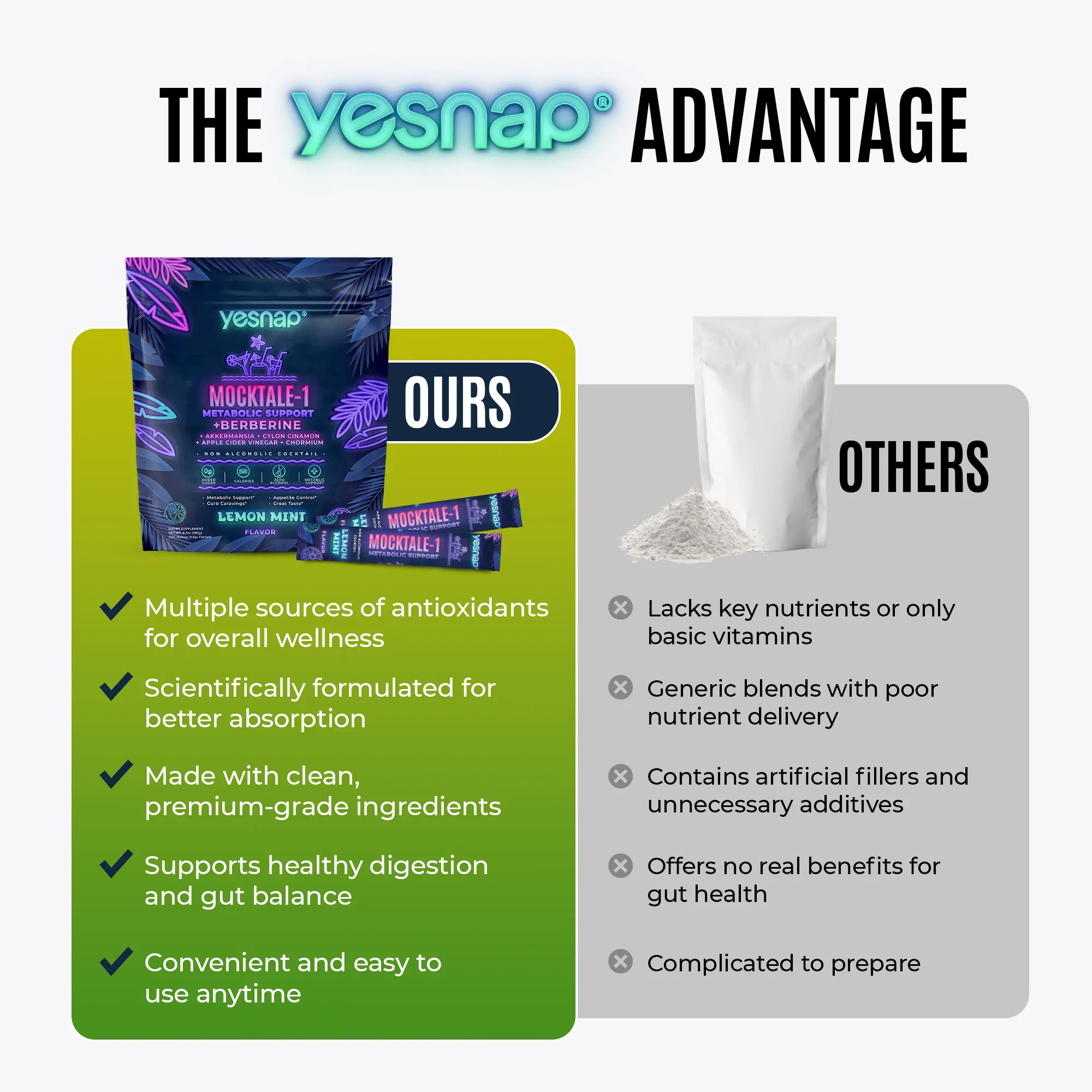 Yesnap MOCKTALE-1 is a refreshing and convenient way to support my wellness routine. The lemon mint flavor tastes great, and I love that it includes berberine, Akkermansia, chromium, Ceylon cinnamon, and apple cider vinegar. Easy single-serve packets make it simple to stay consistent!