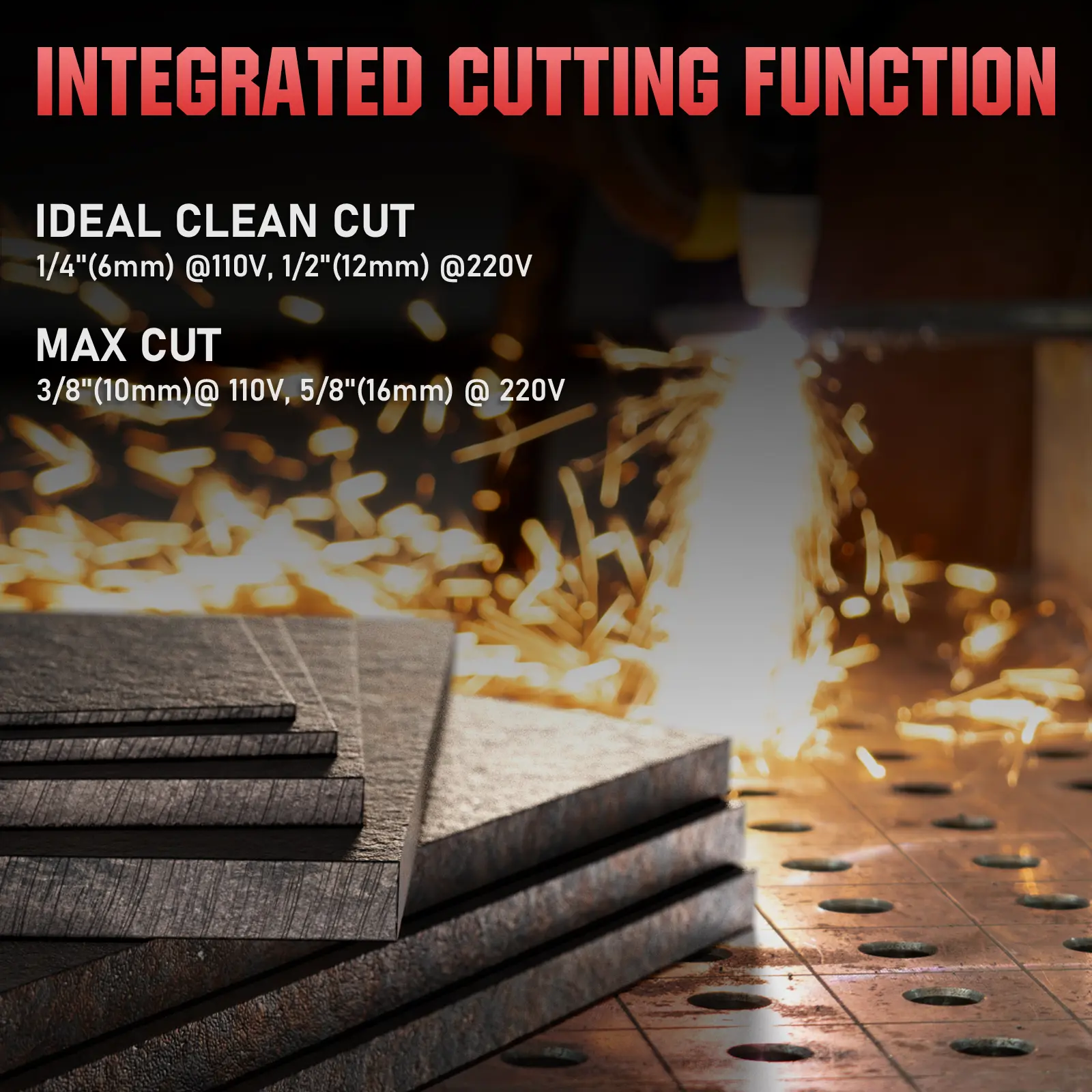 ·20-50A output cuts up to 5/8" (16mm) at 220V or 1/2" (12mm) at 110V.