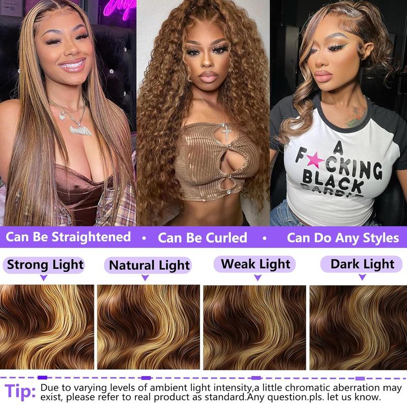 Honey Blonde Wig Human Hair 13X6 Lace: Blonde highlight wig human hair use Swiss HD transparent lace that seamlessly blends with your skin tone, soft and thin, invisible. 6-inch deep parting space allows from middle parts to side parts. Ear to ear highlighted wig human hair 13x6 large lace enables half-up, half-down styles, high ponytails, and buns for a truly natural look
