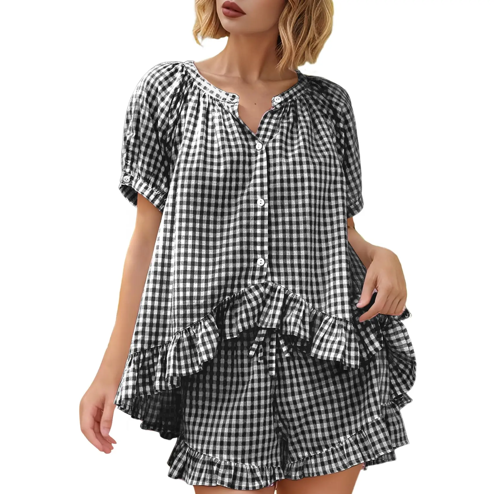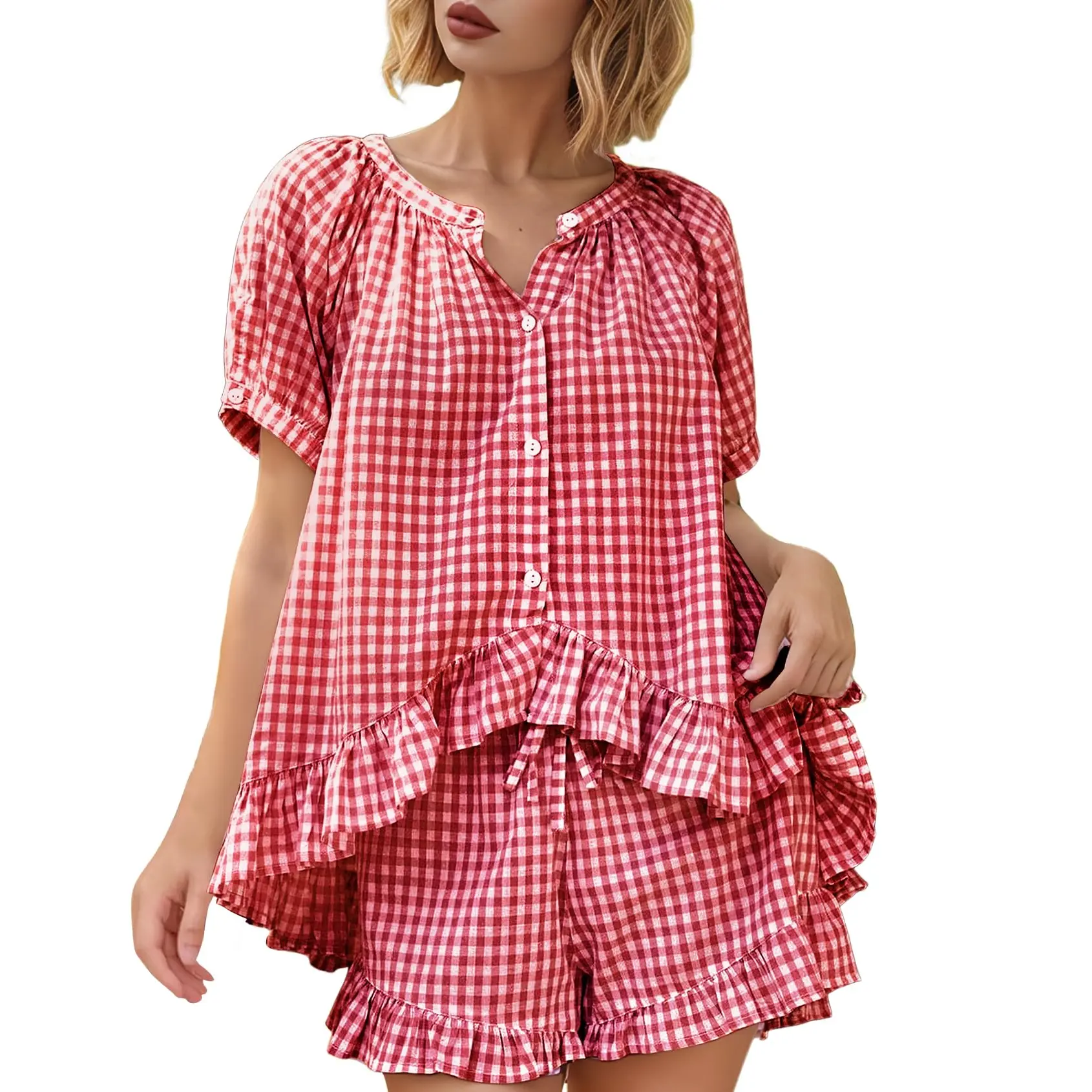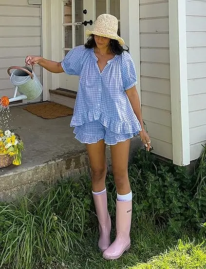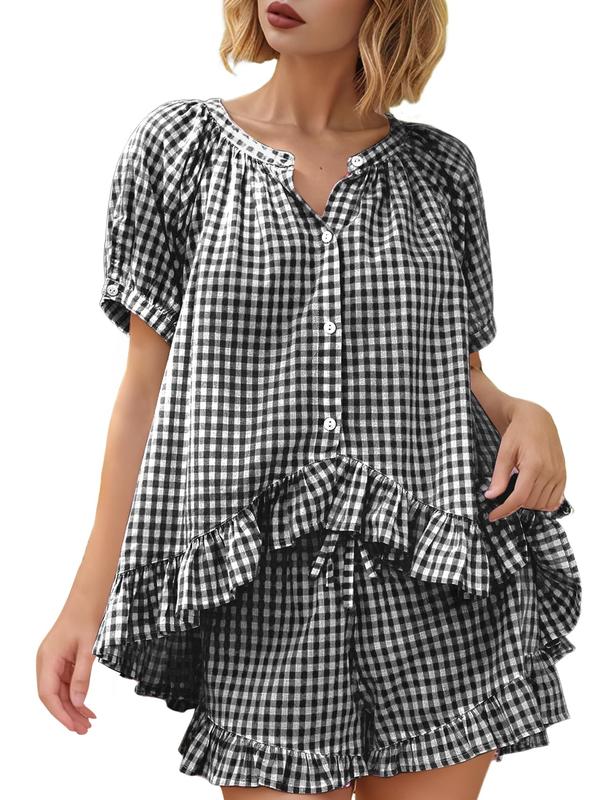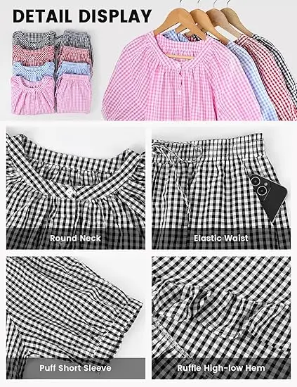 ·Gingham Set Features: Our womens cotton 2 piece pajama set features a classic gingham pattern, button down shirt with short sleeve, chic ruffle hem, v-neck, babydoll shirt top and high-waisted drawstring ruffled shorts with pockets.