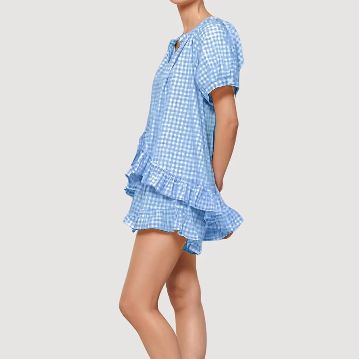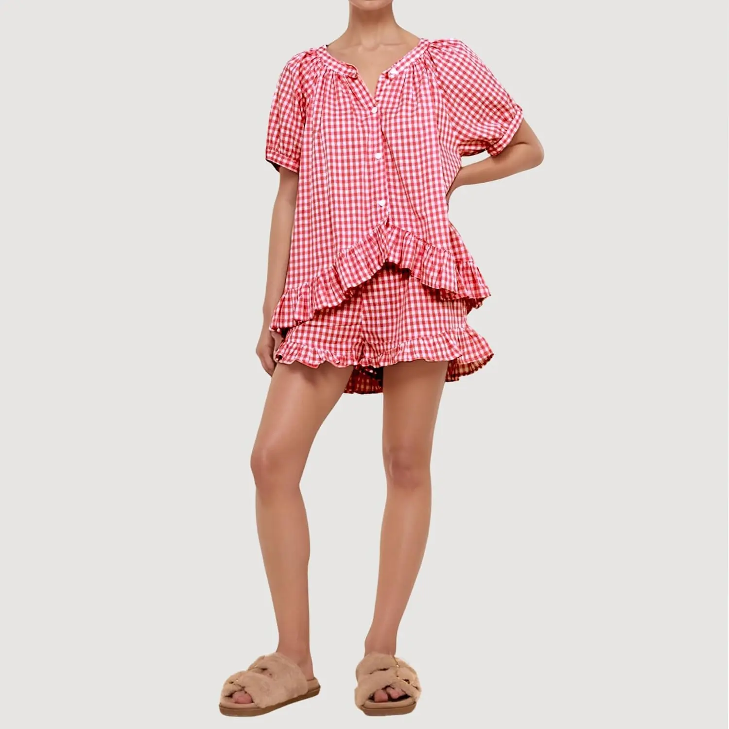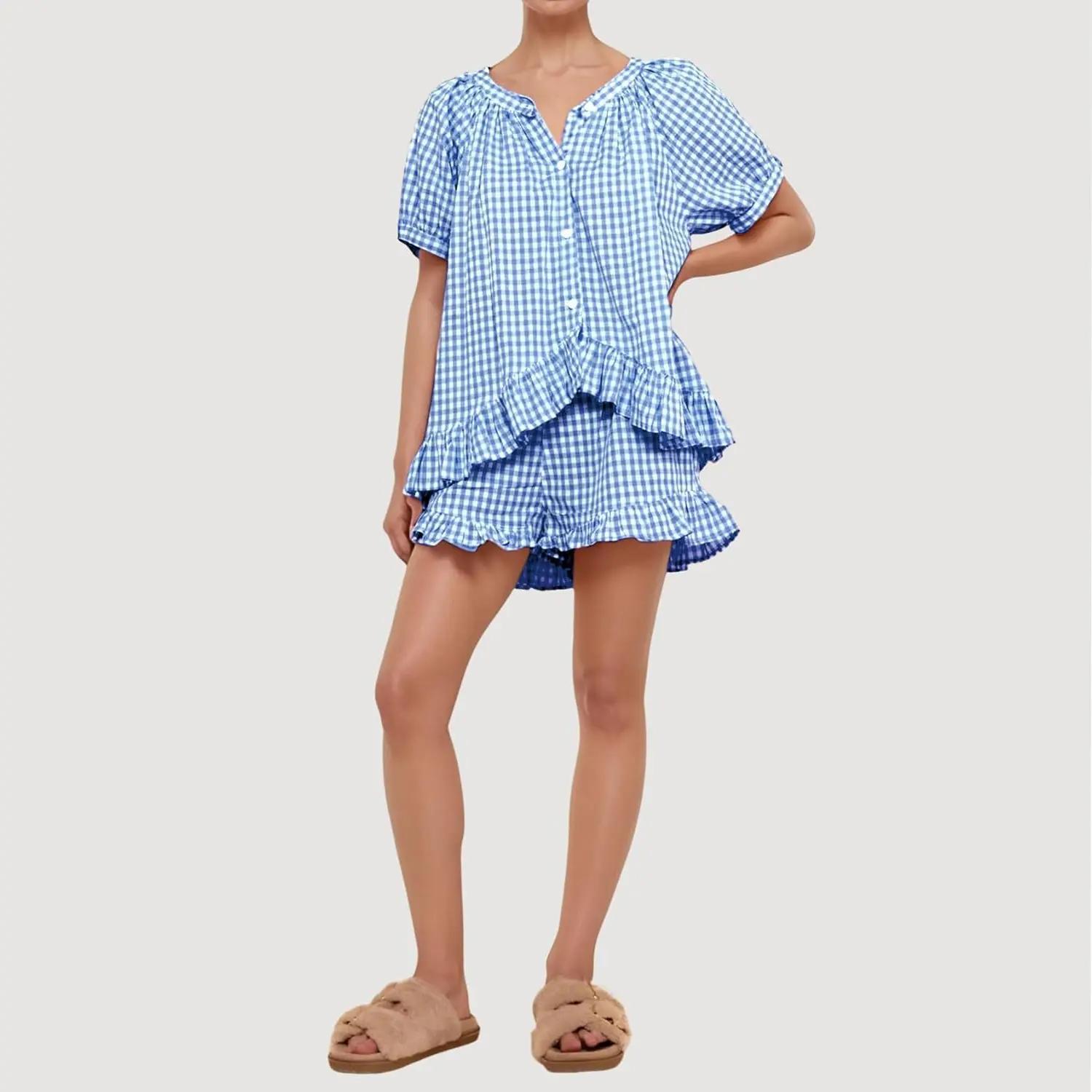 ·Gingham Set Features: Our womens cotton 2 piece pajama set features a classic gingham pattern, button down shirt with short sleeve, chic ruffle hem, v-neck, babydoll shirt top and high-waisted drawstring ruffled shorts with pockets.