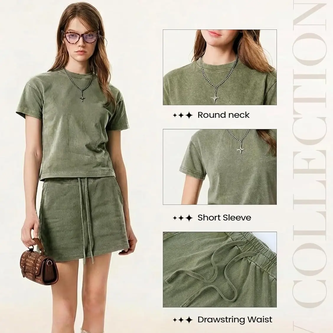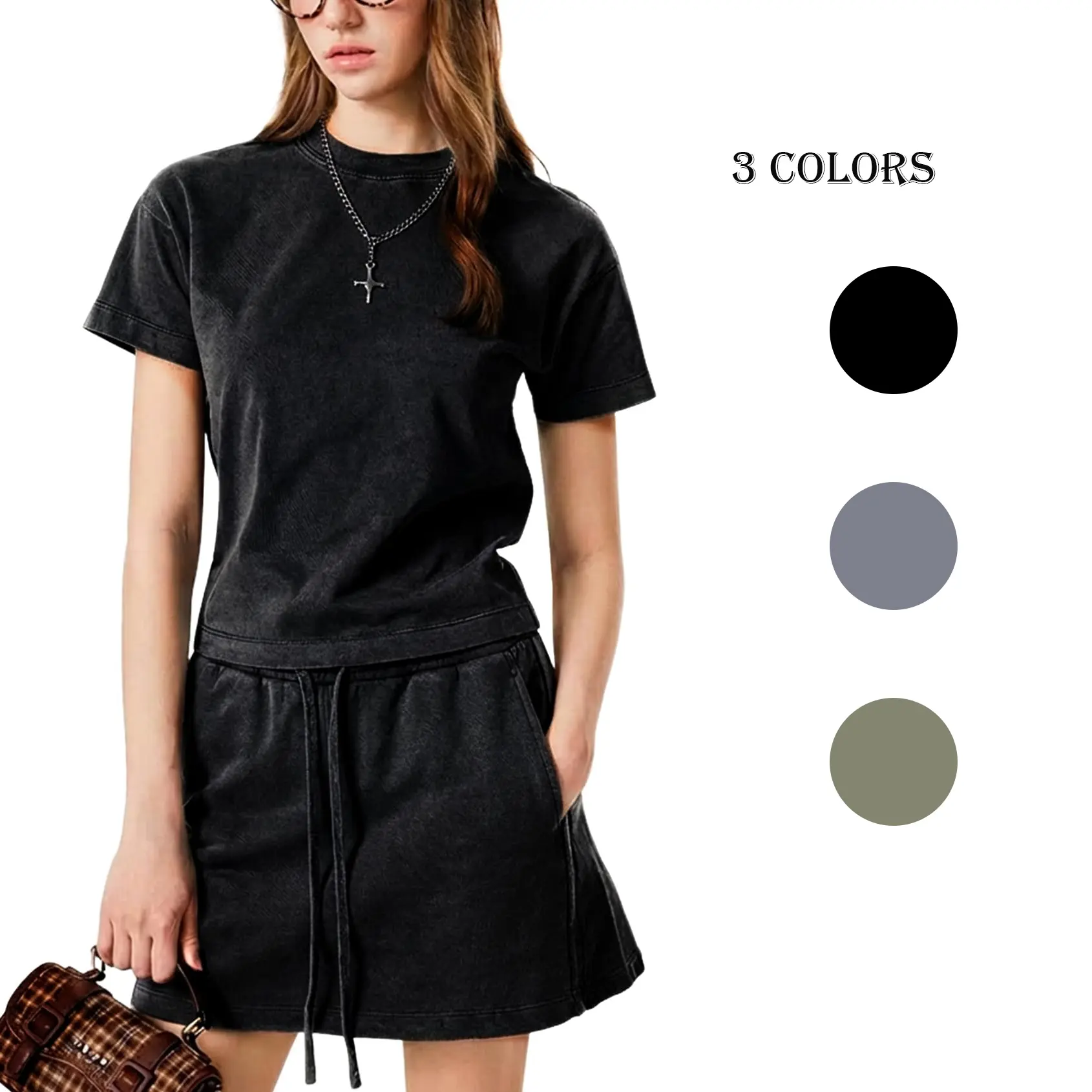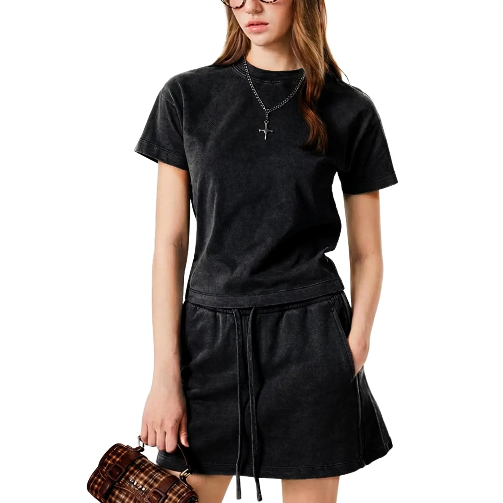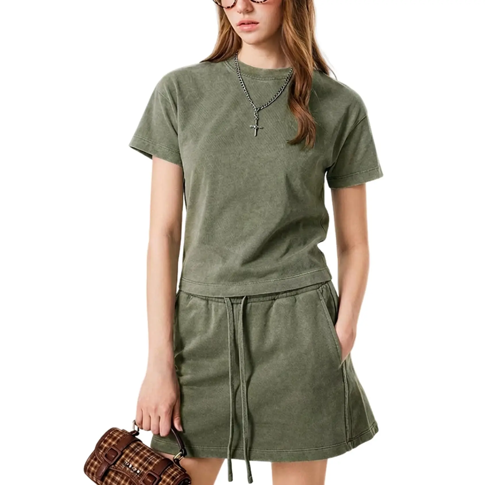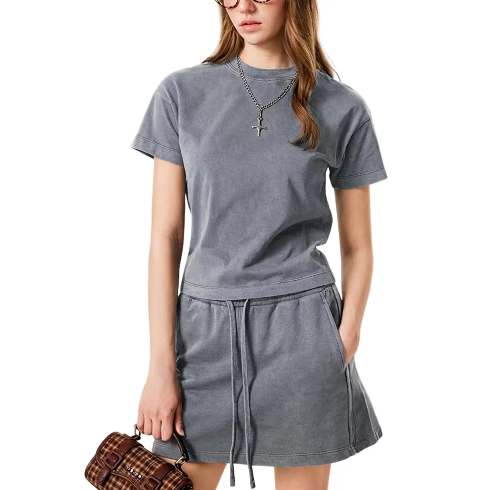 ·Design: Bodycon acid wash crop tee tops, drawstring waist a-line mini skirt with pockets.