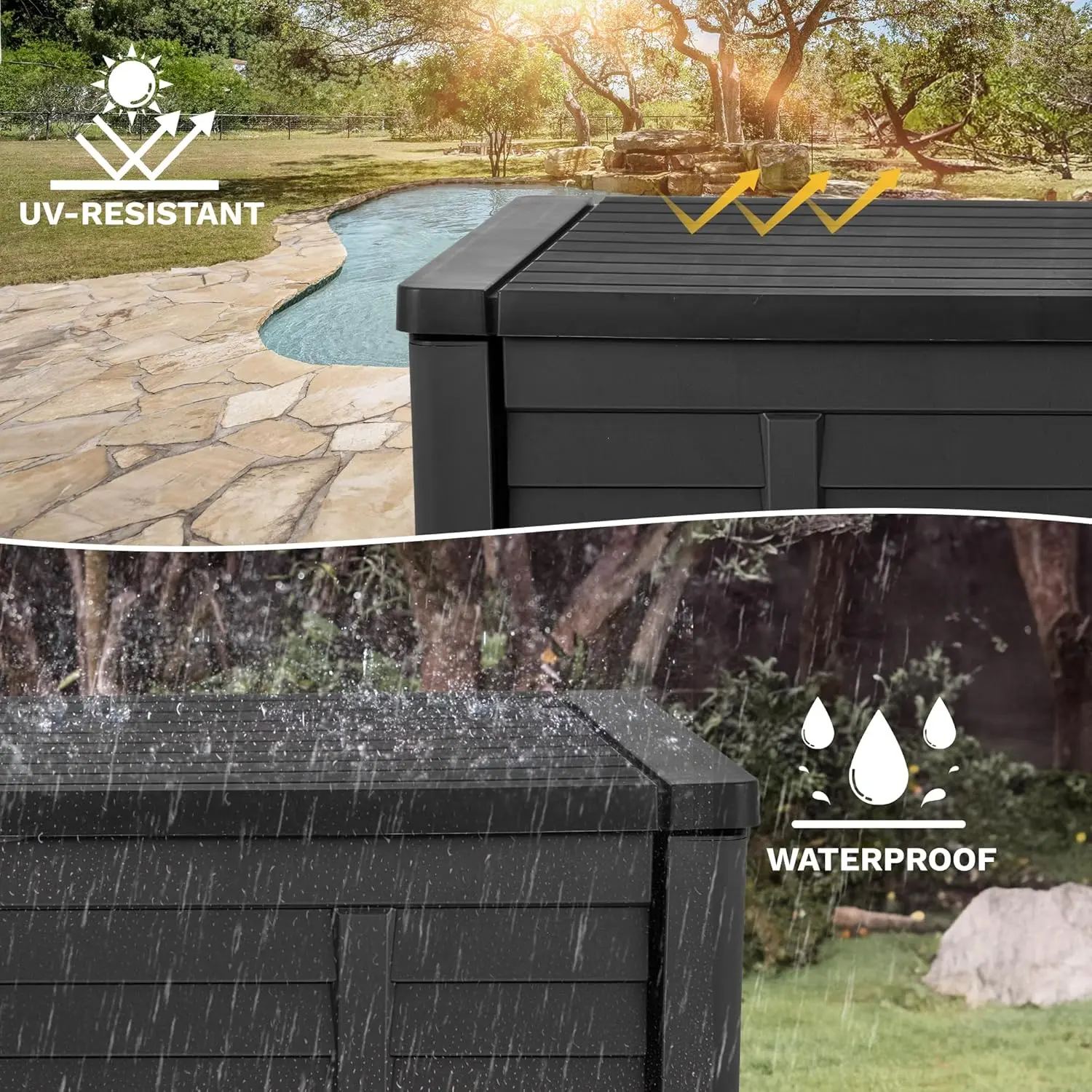 Built to Last: Crafted from weather-resistant resin, these outdoor deck boxes are waterproof, rust-proof, UV-resistant, and fade-proof, making them ideal for long-term outdoor use in various climate conditions