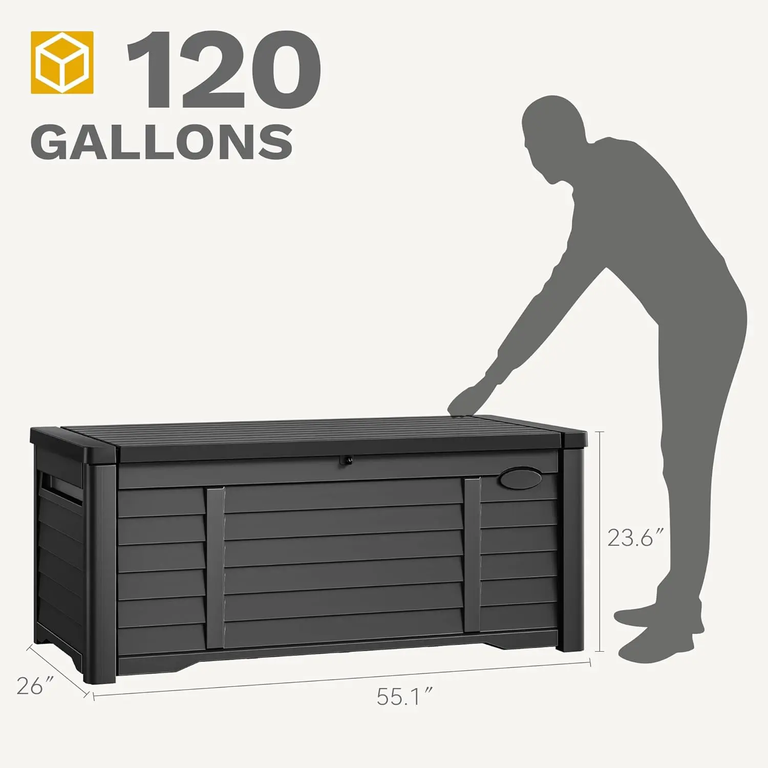 Versatile & Spacious: Transform your outdoor area with our deck box measuring 55.9''x26.6''x23.6'', ideal for storing cushions, garden tools, pool essentials, and more; Its generous 120-gallon capacity makes it an essential addition to any patio or deck