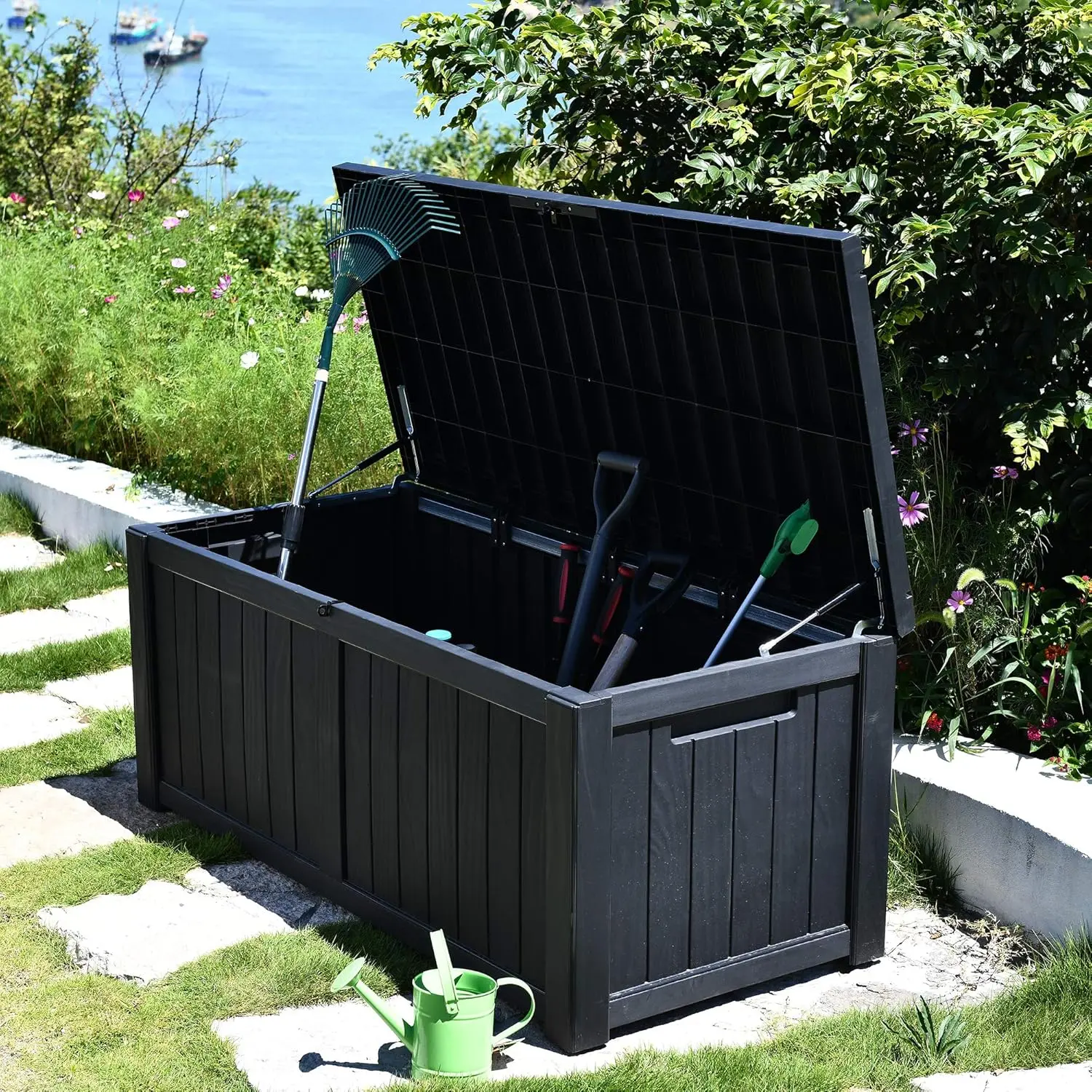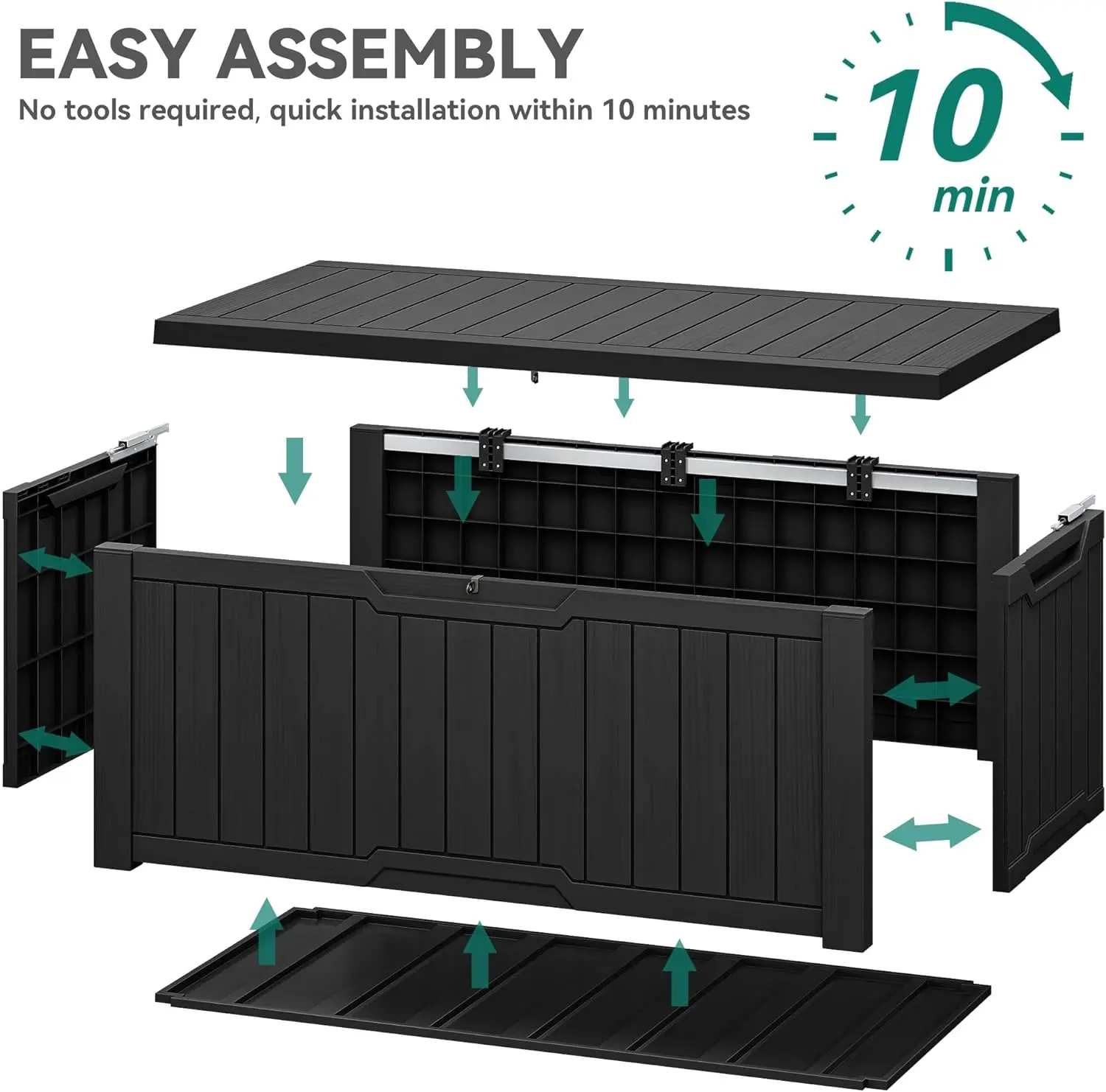 Effortless Care: Crafted from weather-resistant resin, this black outdoor storage box keeps the interior dry and the exterior fade-resistant, ensuring long-lasting durability; Simply wipe clean to maintain its pristine appearance