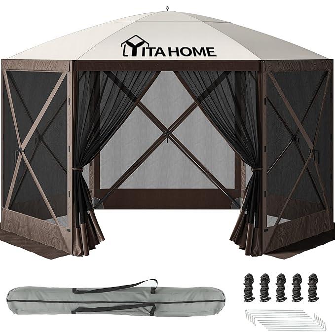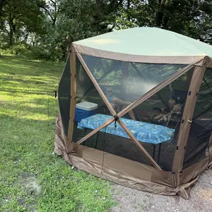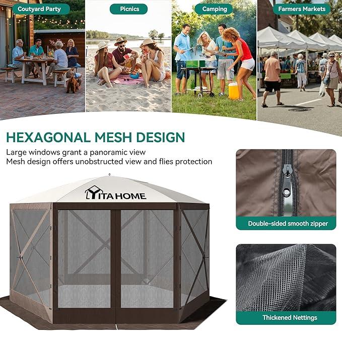 Ample Space: The 12x12ft pop-up tent, designed with a hexagonal structure, provides a spacious interior that can comfortably accommodate 6-8 people and their camping gear, offering ample space for activities and gatherings.