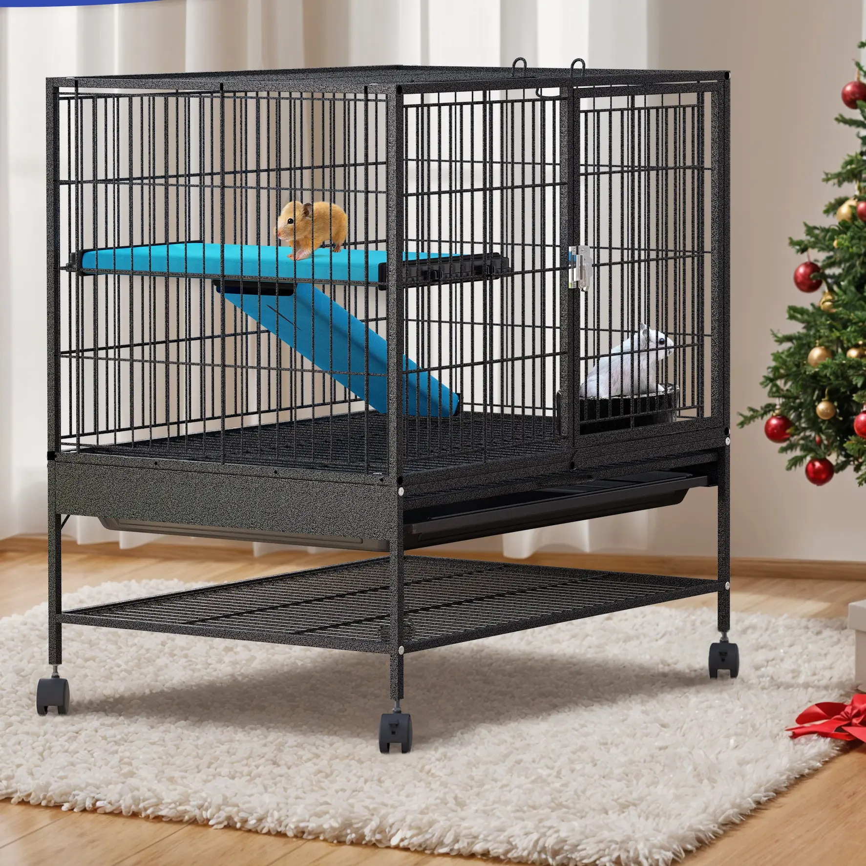Easy to move: This hamster cage has 4 universal wheels that can rotate 360 °, so you You can easily move or transport to indoor and outdoor! In addition, there is a storage rack with wide space above the wheel for keeping pet accessory handy and neat.