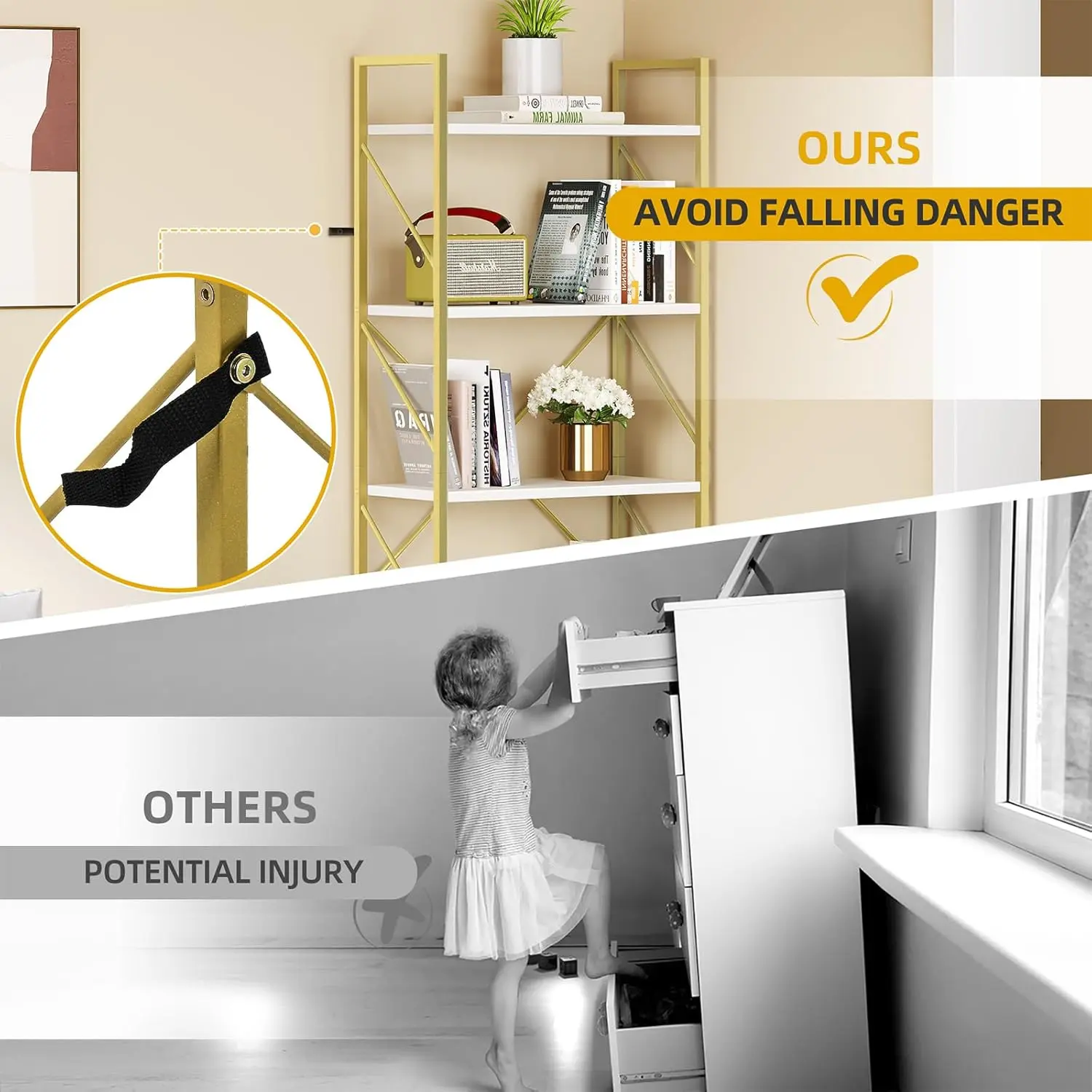 Anti-tip Kits & Easy Assembly - Please remember to install the anti-tilting tool on the wall for better stability and less unexpected injuries. All necessary accessories, tools, and illustrated instruction will be packed. You can finish the whole installation effortlessly and quickly.
