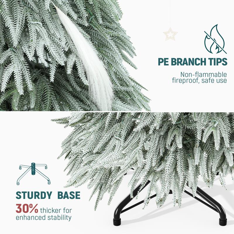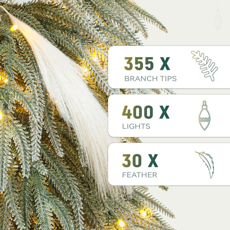 --Natural Drooping Design: Our 6ft tall Christmas tree showcases a unique natural drooping branch style; Adorned with 355 branch tips, this snow-flocked artificial tree adds a soft and elegant touch to your decor; Comes with an additional 30 feathers for added charm