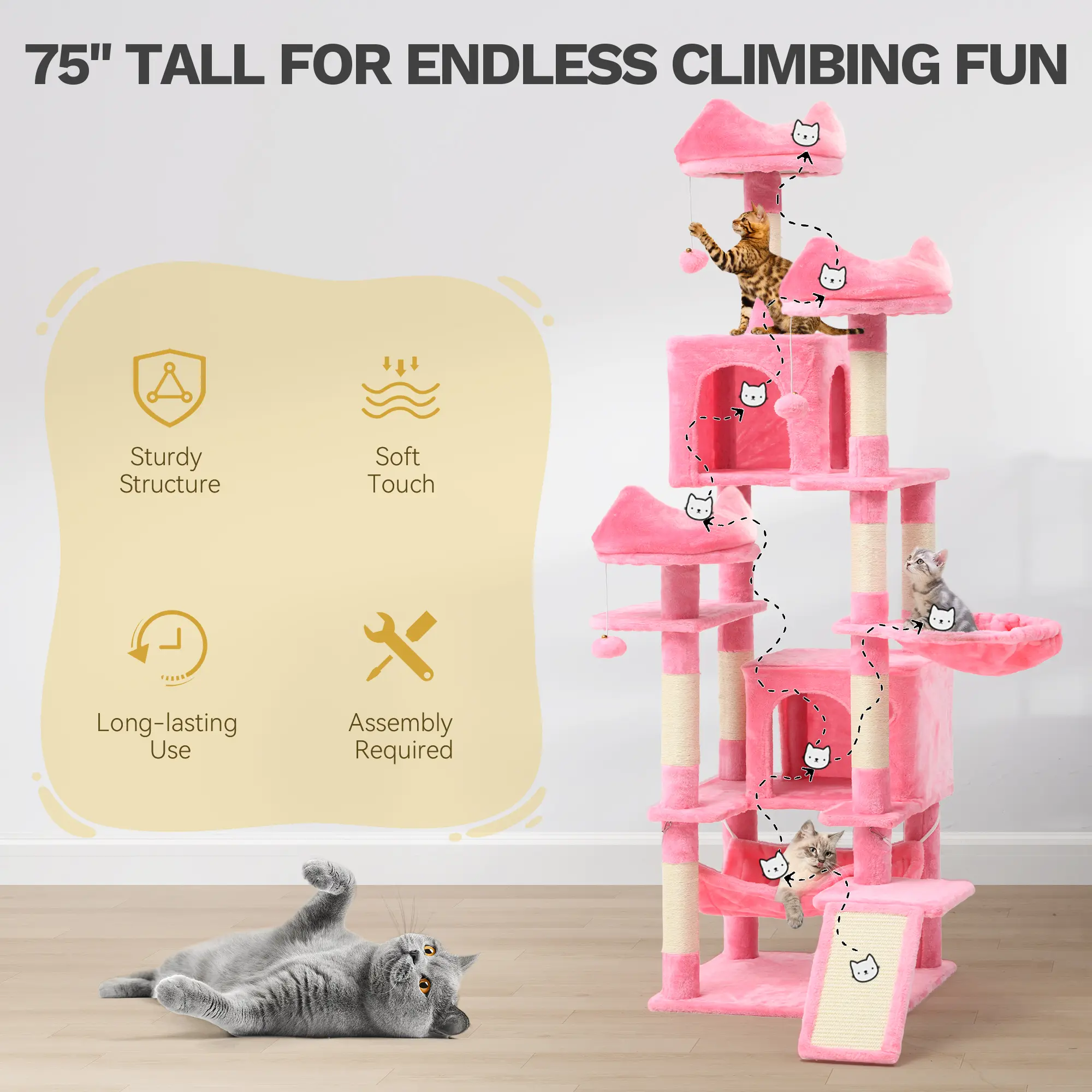 I can't recommend this cat tree enough! My cats are a little...chunky or on the bigger side and they fit perfect on this. Most cat trees are too small or they dont care about it, but they wont leave this one alone! They already ripped the bells and balls off it from playing so much.