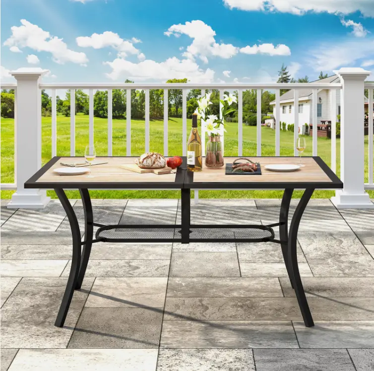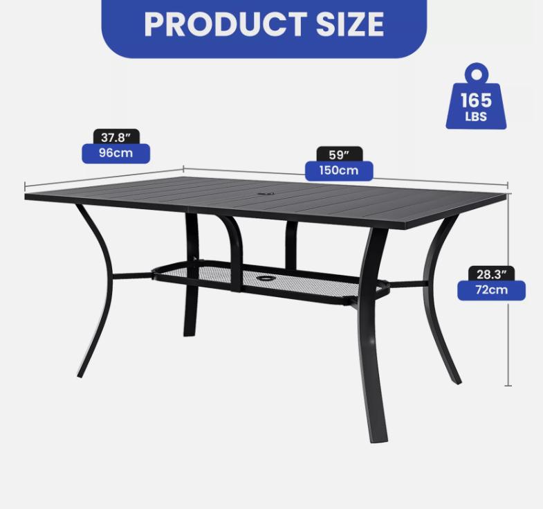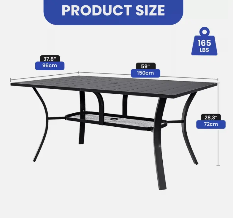 2.Perfect Size for Gathering: Measuring at 59"x 37.8"x 28.3", with a 1.57'' umbrella hole, this patio dining table is the ideal choice for setting up a gathering spot. With its spacious dimensions, it comfortably accommodates up to 6 people. The simple construction ensures ample under-leg space, while the table legs are reinforced for added strength and stability, guaranteeing a comfortable and reliable dining experience.