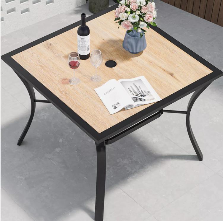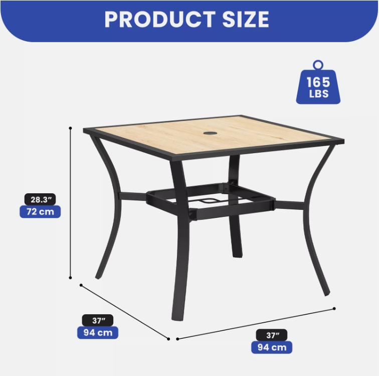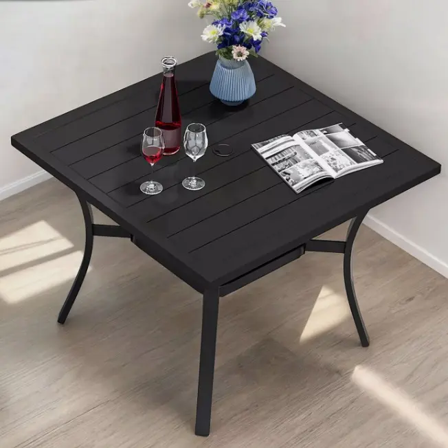 1.Rust-Resistant Frame with Stylish Design: Our outdoor dining table stands out with its powder-coated black-finished frame that provides excellent protection against rust and paint-off. This table effortlessly enhances the aesthetics of your backyard or patio space, adding a touch of stylish comfort to your outdoor gatherings. Whether it's on the deck, in the garden, on the lawn, or in the backyard, this table is the perfect addition.