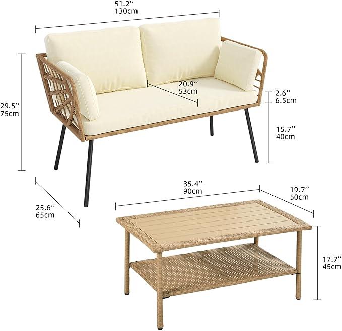 Dimension & Package List: This patio porch furniture set includes 1 love-seat sofa, 1 folding seat cushions, 2 fluffy back cushions & 2 lumbar pillows, 1 side table. Love-seat dimension: 51.2" x 25.6" x 29.5", Side table dimension: 35.4" x19.7"x17.7".