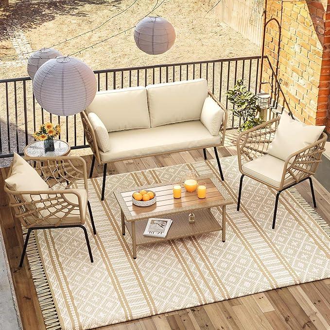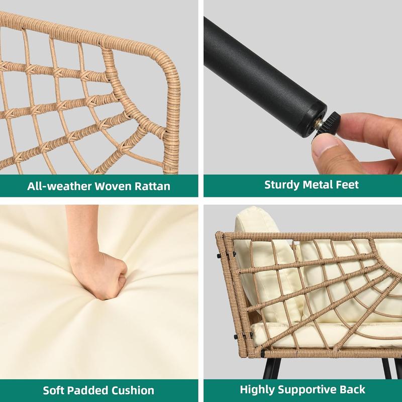 Robust & Secure: Constructed using a plated steel frame covered with all-weather PE wicker, this patio conversation set is more rust-proof and stronger enough to hold up 529lbs; 4 adjustable anti-slip feet help you sit stably to enjoy lounging & chatting with friends or families.
