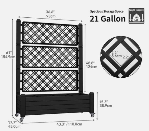 1. Planter with Trellis: Enhance your garden or patio with our 61" high planter with trellis, providing ample support and space for climbing plants. The vertical trellis can be easily detached or added to achieve the desired height, making it perfect for showcasing potted plants or decorations.