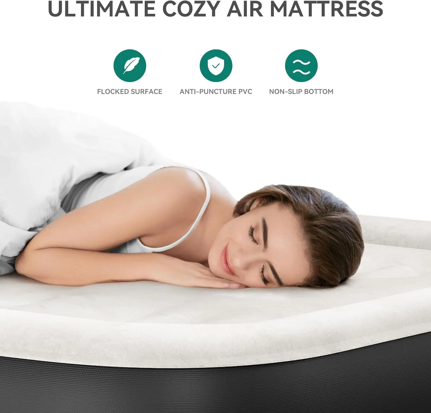 Sturdy and Soft: This air mattress with built in pump is made from multi-layer, extra-thick waterproof material for durability and puncture resistance; The top surface features an additional velvety layer for luxurious softness, ensuring a comfortable night's sleep