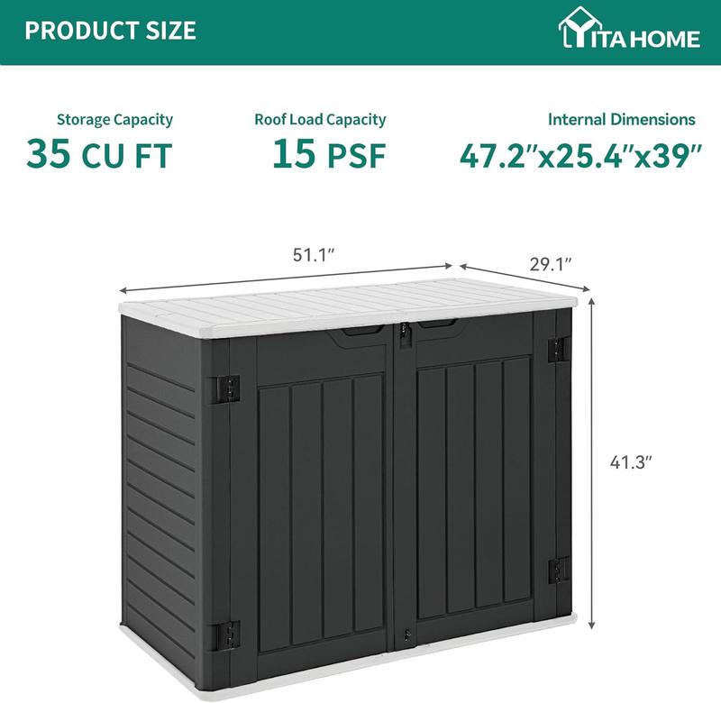 Large storage capacity and the external size of 51.1 * 41.3 * 29.1 "L" W "H, inner size is 47.2 * 25.4" L "W * 39" H. The plastic storage shed has a capacity of 27.05 cubic feet; Suitable for storing garden tools, lawn mowers, bicycles, garden furniture, 2 x 34 gallon trash can.
