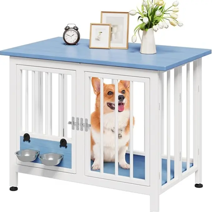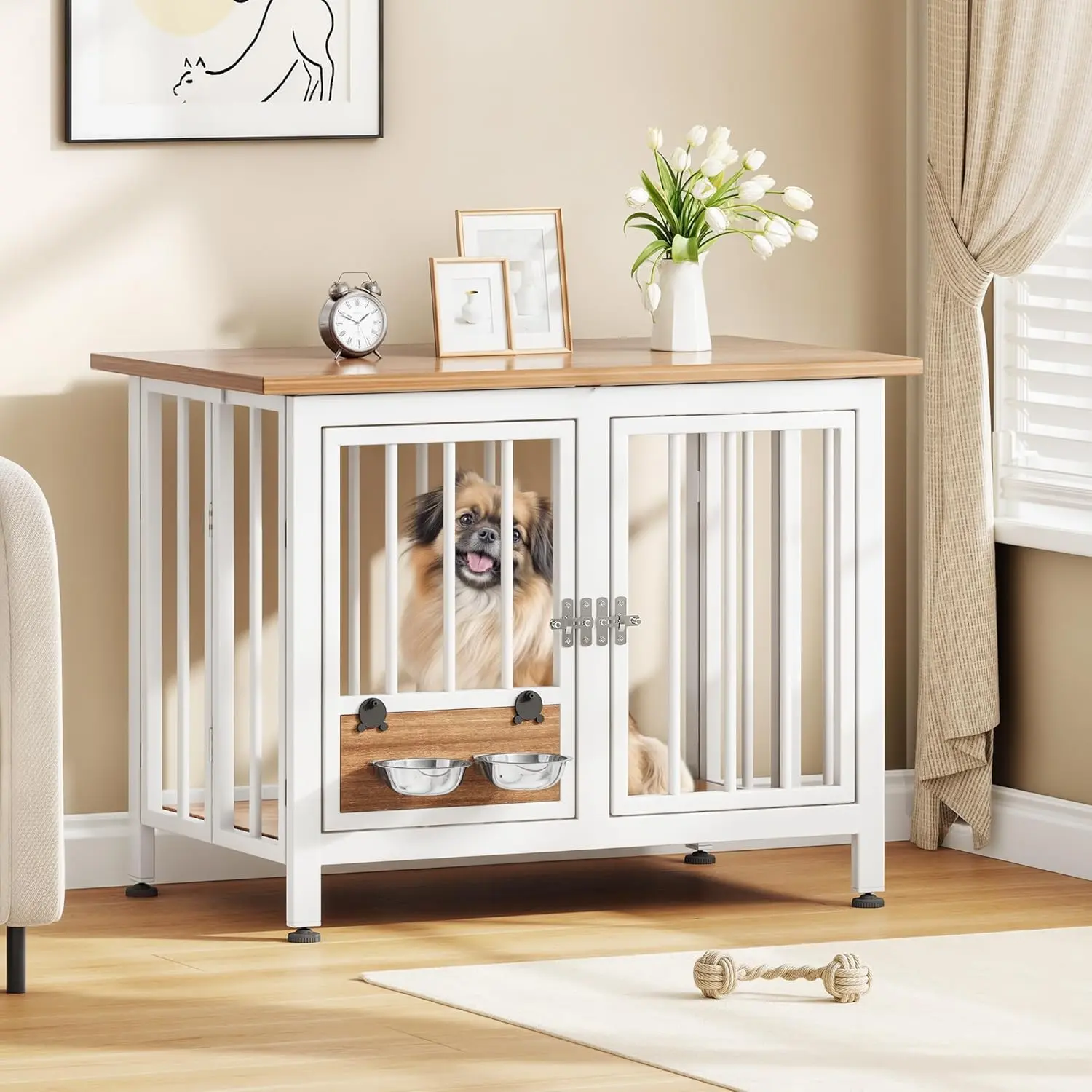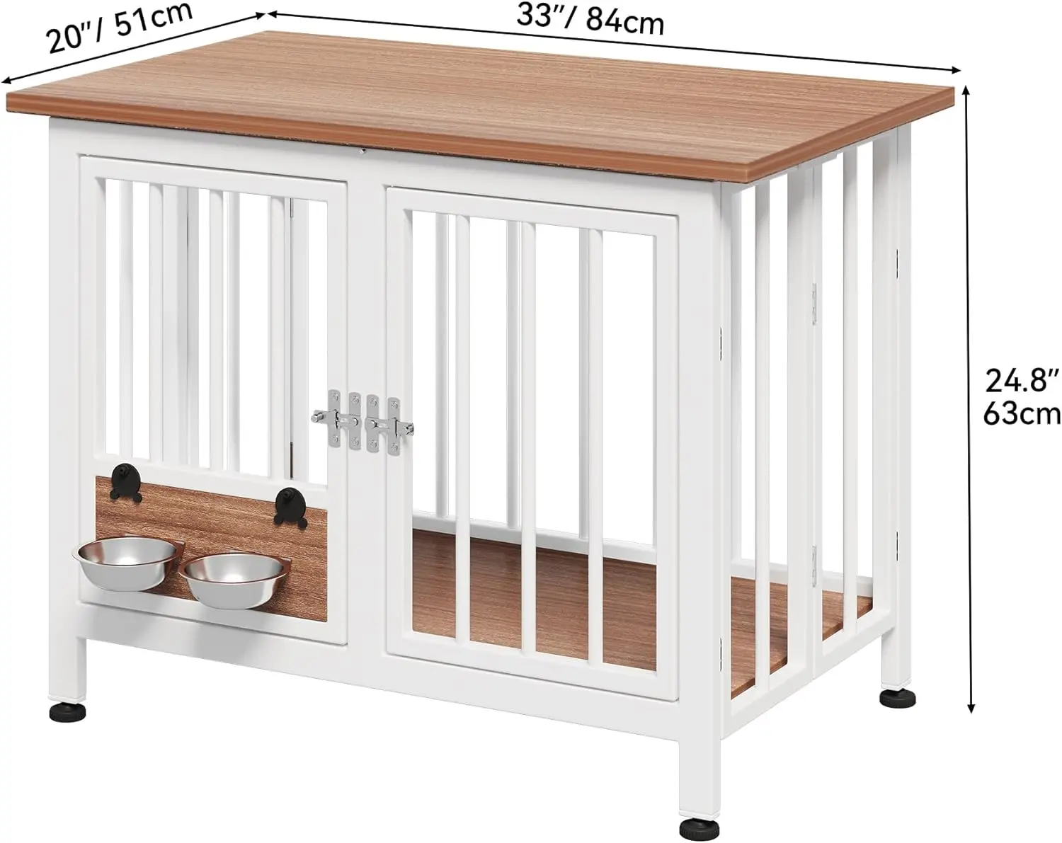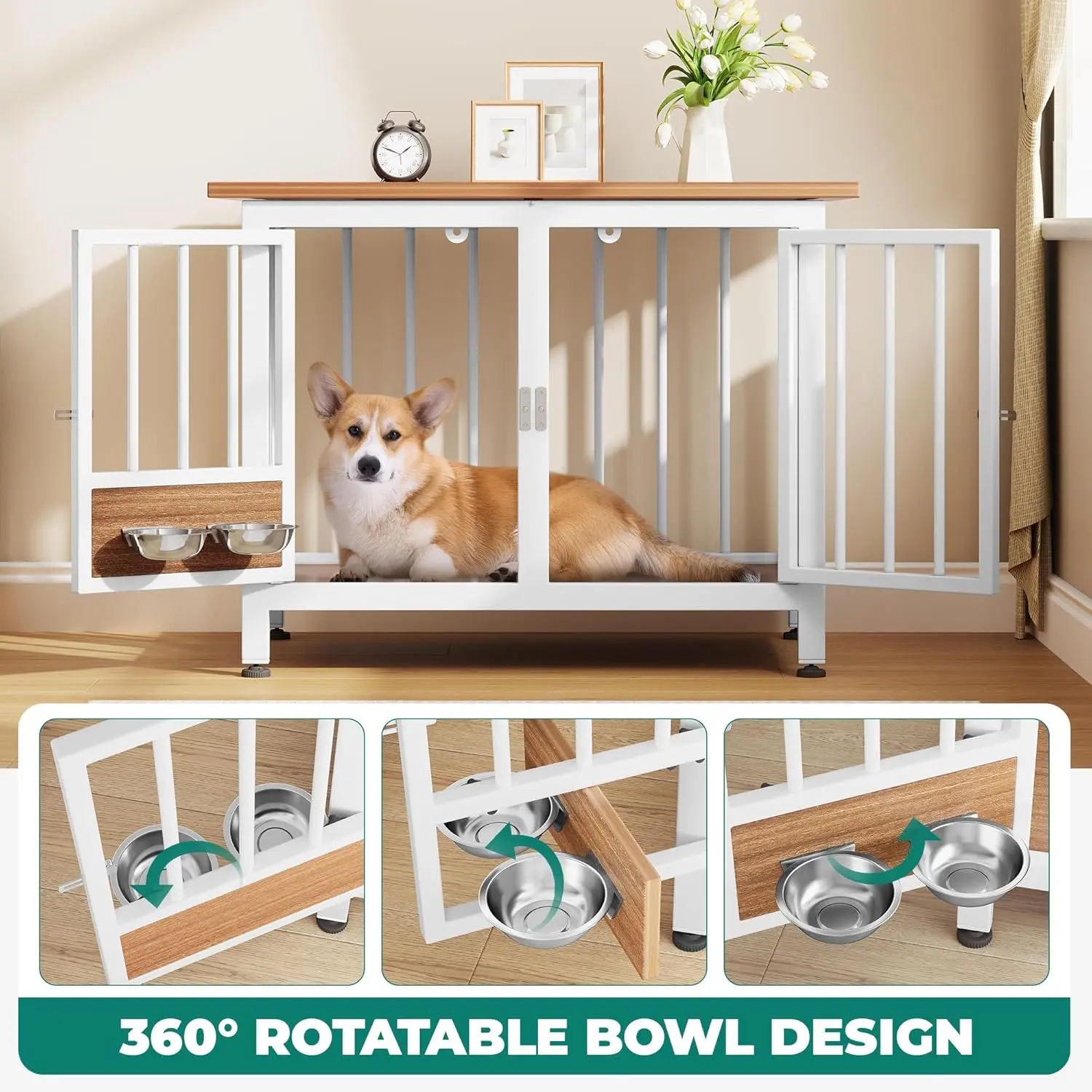 【Dog Crate with 360° Rotatable Bowls】The Dog Crate Furniture is equipped with 2 360° rotatable stainless steel bowls, which are convenient for feeding without opening the front door, simply rotate the bowls for convenient access. The dog crate can also be used as a side table, saving space while offering additional storage for pet supplies on its spacious desktop.