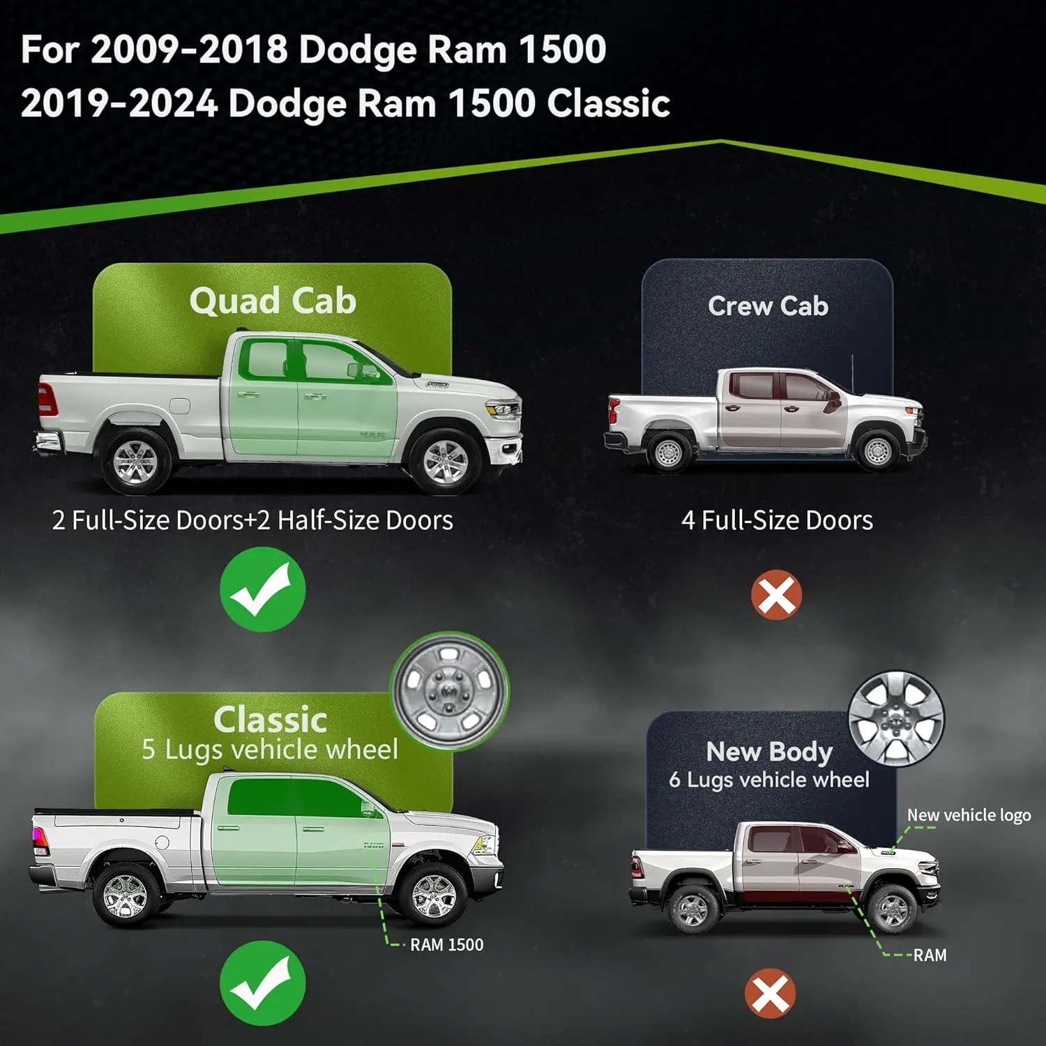 ·Fits 2009-2018 Dodge RAM 1500 and 2019-2024 Ram 1500 Classic Quad Cab models. Upgrade your vehicle's performance with these reliable side steps. No compromises on style or functionality.