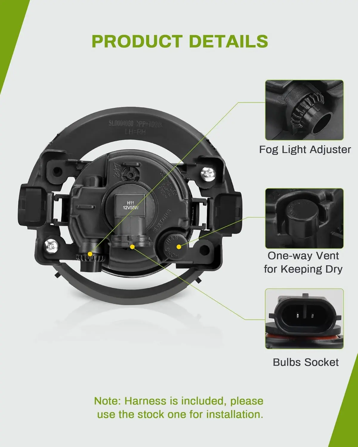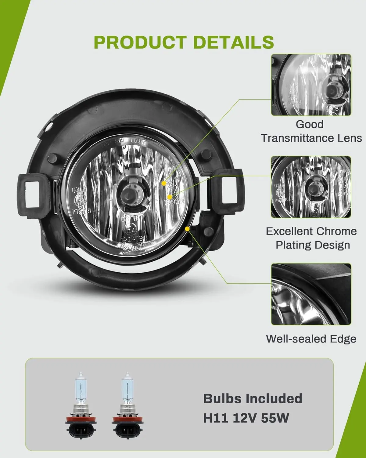 ·Power: H11 12V 55W bulbs provide reliable illumination.