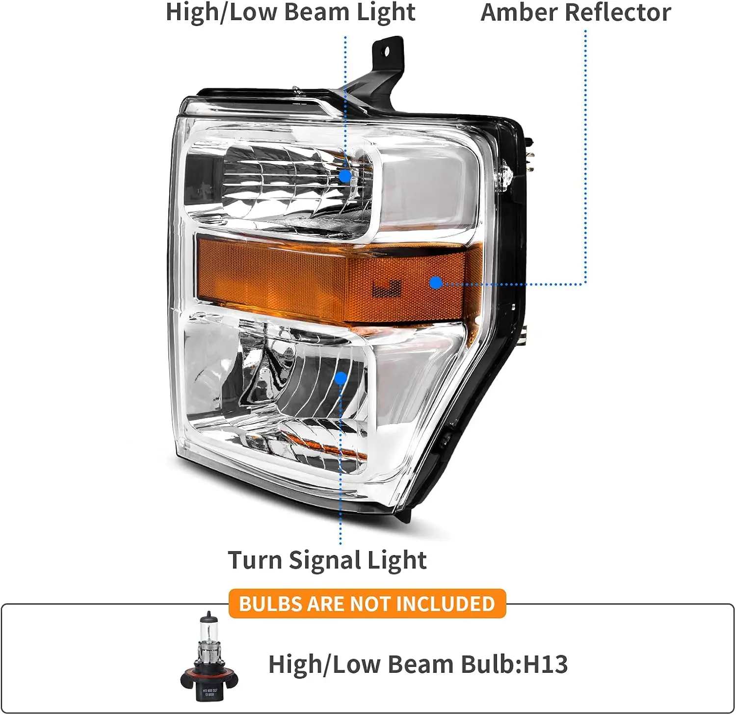 ·Compatibility: the headlight assemblies are compatible with 2008-2010 Ford F-250 F-350 F-450 F-550 Super Duty; high/low beam bulb type: H13; bulbs are not included