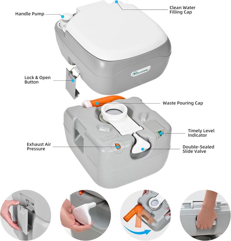 The YITAMOTOR Portable Toilet is a compact solution for your travel needs. It holds 5.8 gallons of waste, perfect for motorhome, car, boat, and outdoor use. This toilet features a handle pump and a level indicator for convenience. It's odourless and leak-proof, ensuring a hygienic experience. Ideal for both indoor and outdoor settings.