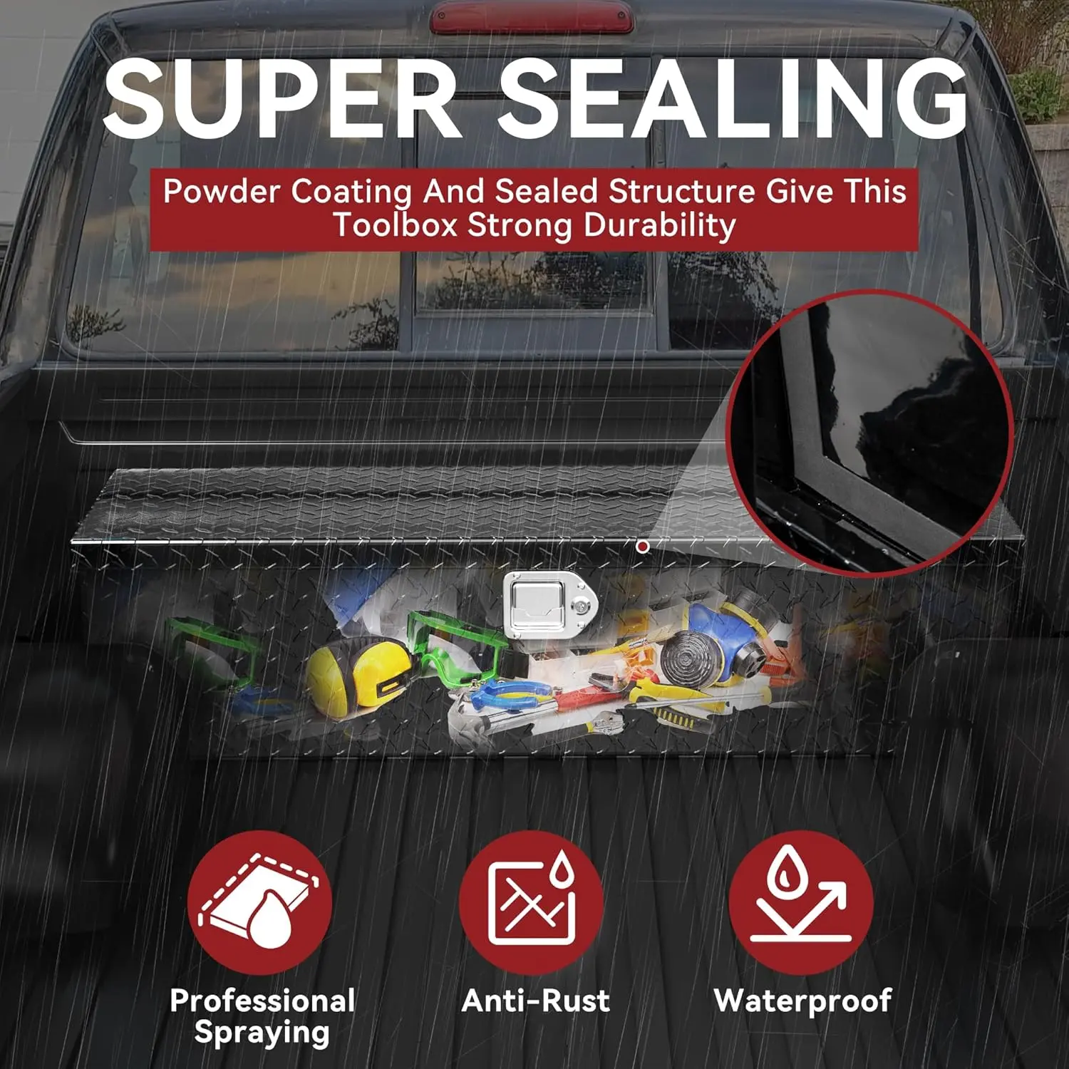 WEATHER PROTECTION: This toolbox is designed with sealing strips and professional powder coating provides effective water and rust resistance, keeping tools dry and safe from wet environments