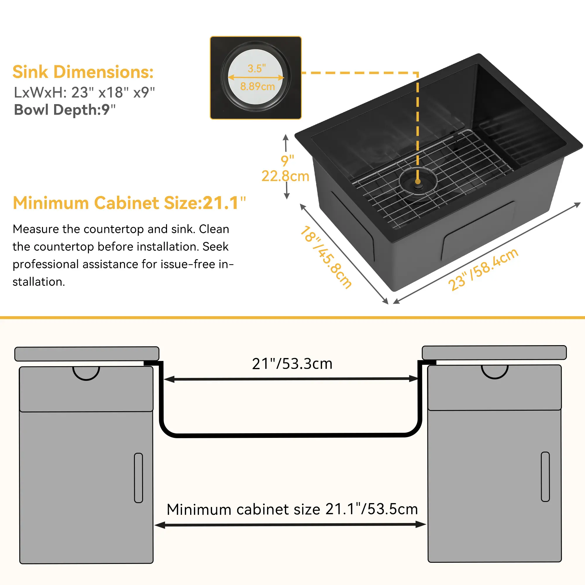 【Spacious & Stylish】23*18*10in The undermount sink offers ample space with its 23" x 18" x 10" dimensions, featuring small radius corners for a modern look; The standard 3.5-inch drain opening fits any garbage disposal; Comes with a dish grid, basket strainer drain, and S-shaped water hose for added convenience