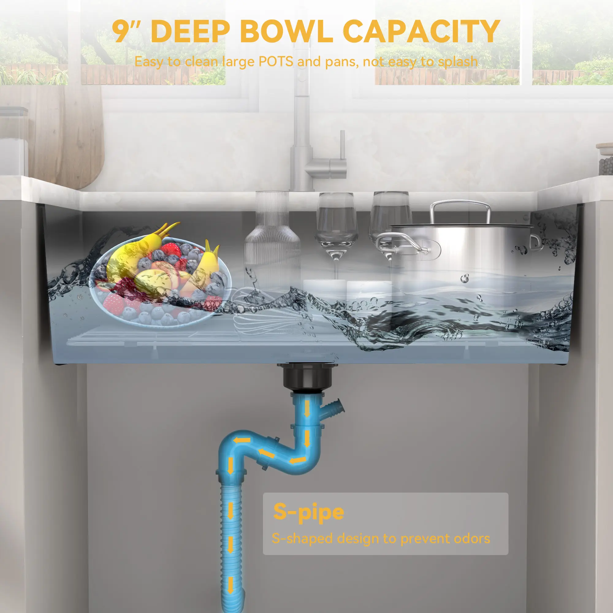 【Efficient Drainage】The undermount kitchen sink features a sloping bottom and offset drain outlet for smooth water drainage; The included S-shaped water pipe prevents odors from spreading, while the removable decorative drain cover adds a clean finish